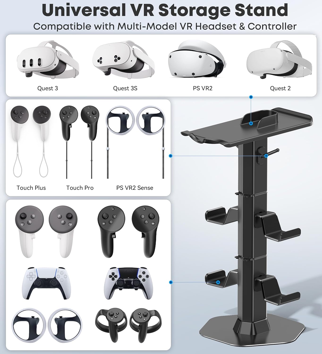 - Upgraded storage holder with vr headset stand: This vr stand hangs most VR headsets on the market, such as Quest 3, Quest 2, Meta Quest Pro, Meta Quest 3, etc.
