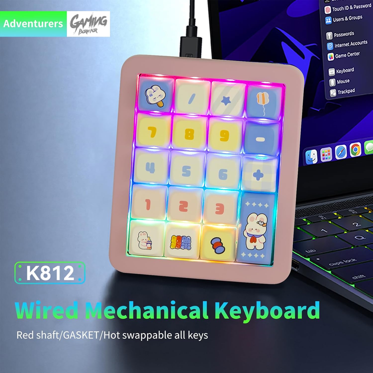 Adventurers K812 Wired Mechanical Numeric Keypad, 19-Key Hot-Swappable RGB Numpad, Macro Programmable, Detachable Type-C Cable, Game/Office Mode Switch – for PC/Laptop/Desktop (Pink)