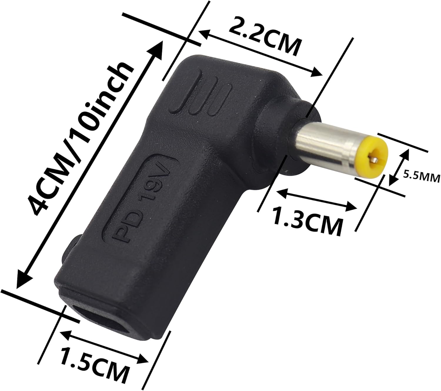 - [Main parameter ]: PD Type C Female Connector to DC5.5 * 2.5mm Male Connector Power adapter connector.1:PD Type C Female Connector, 2: DC5.5x2.5mm Male Connector.<br> CableTotal length: 1.6 inches/4CM, width: 2.2CM, height: 1CM. <br>Material: Black high-quality PVC plastic. <br> cable port : black plastic supports 19V Color: Black