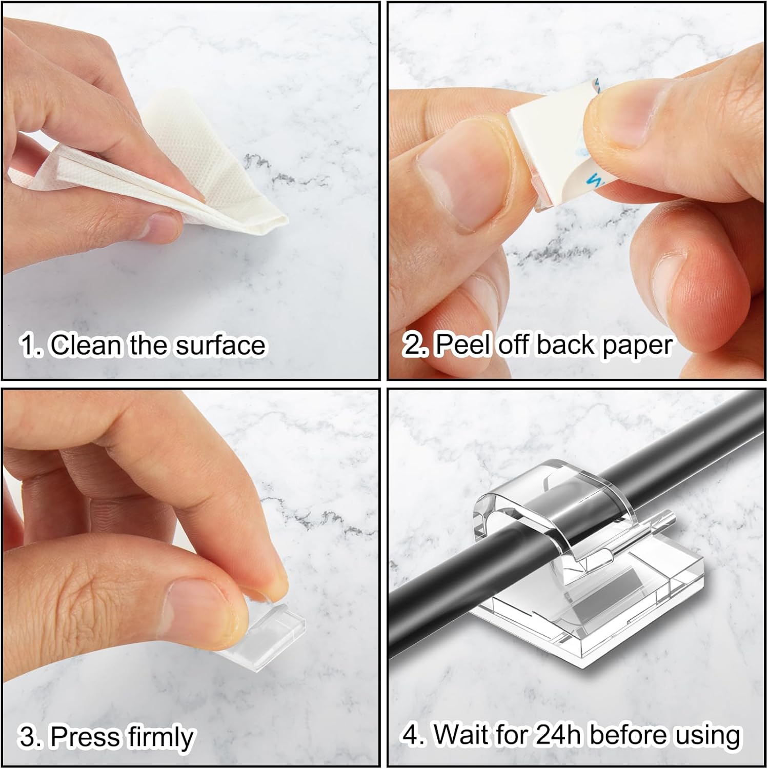 - Self-Adhesive Clips: Sticky cable holder clip with self adhesive pad can grip the surfaces stably which can be removed easily without damage to the desktop and with no residue leaving on the surfaces.