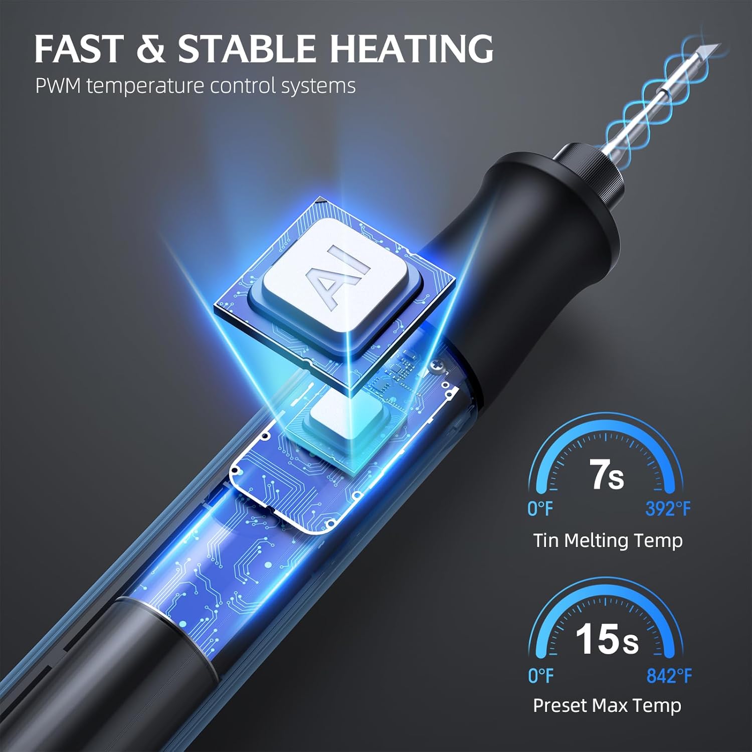 - 【Intelligent Energy Saving】The built-in weight sensor, the soldering iron stand still for 40 seconds will enter sleep mode, enhancing safety and battery life during prolonged repair sessions.to prevent overheating and ensure safety. Automatically restart to heat up to the temperature you set when picking it up again.