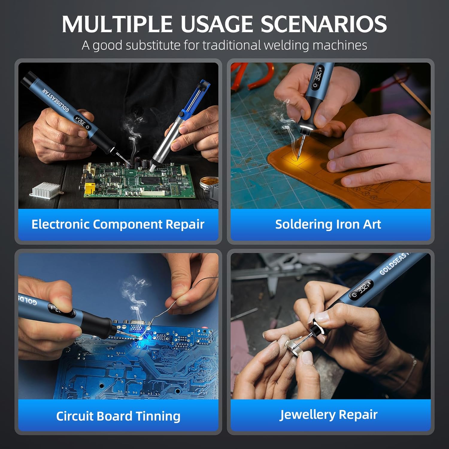 - 【Precise Temperature Control】Equipped with LED display to accurately display temperature values, mode status and battery level.The temperature can be adjusted from 200°C to 450°C by turning the knob at the end of the soldering iron. Its provides precise temperature control for various soldering tasks.