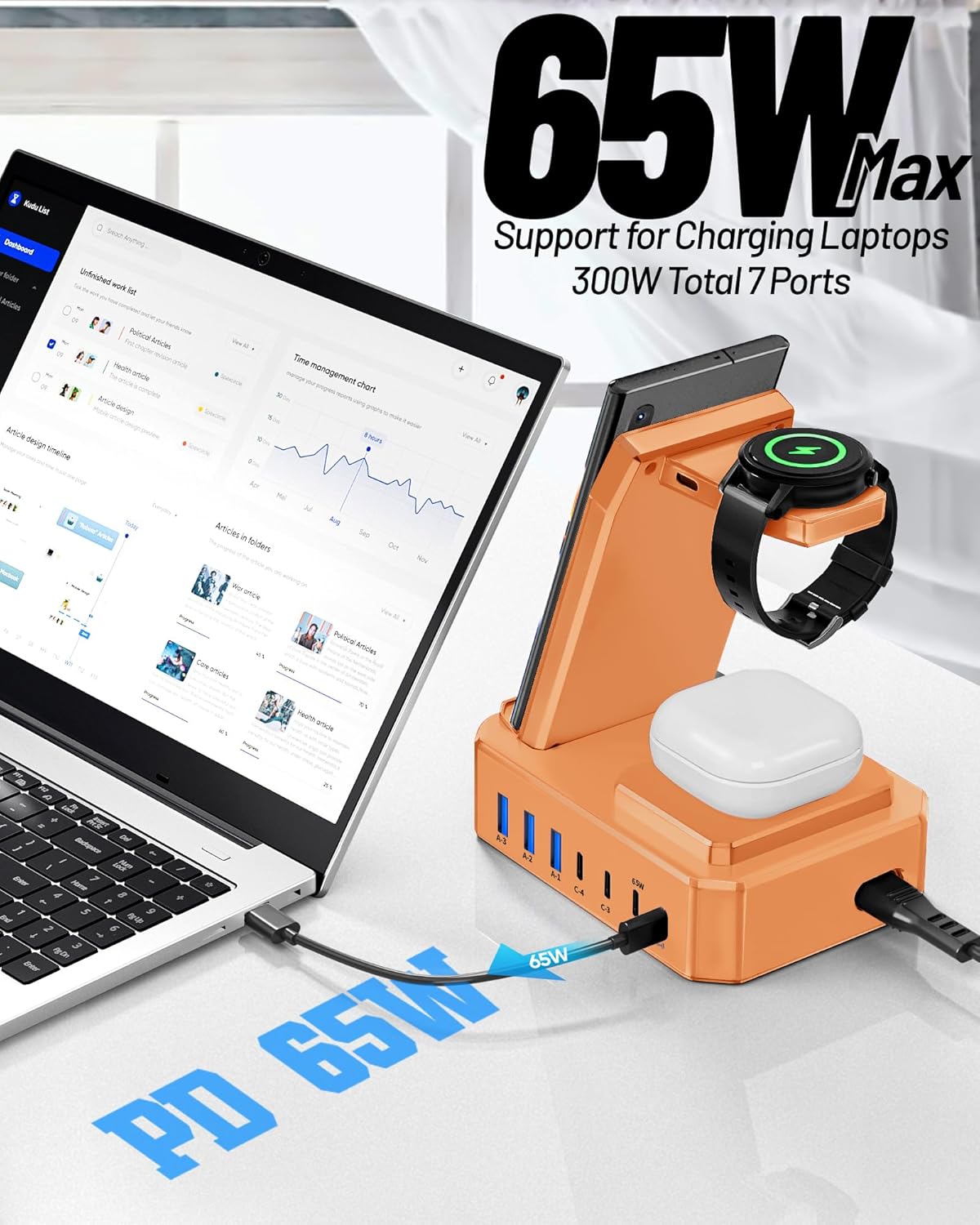 - 【300W Charging Station for Multiple Devices】: Charges up to 10 devices simultaneously.This desktop phone charging station is the perfect solution for charging multiple devices! Our charger station features 2 powerful 65W USB-C ports designed specifically for charging laptops, 2 efficient 30W USB-C ports and 3 versatile 30W USB-A ports . Samsung wireless charging station total output can be up to 300W. You can conveniently fast charge your samsung devices and other devices at the same time.