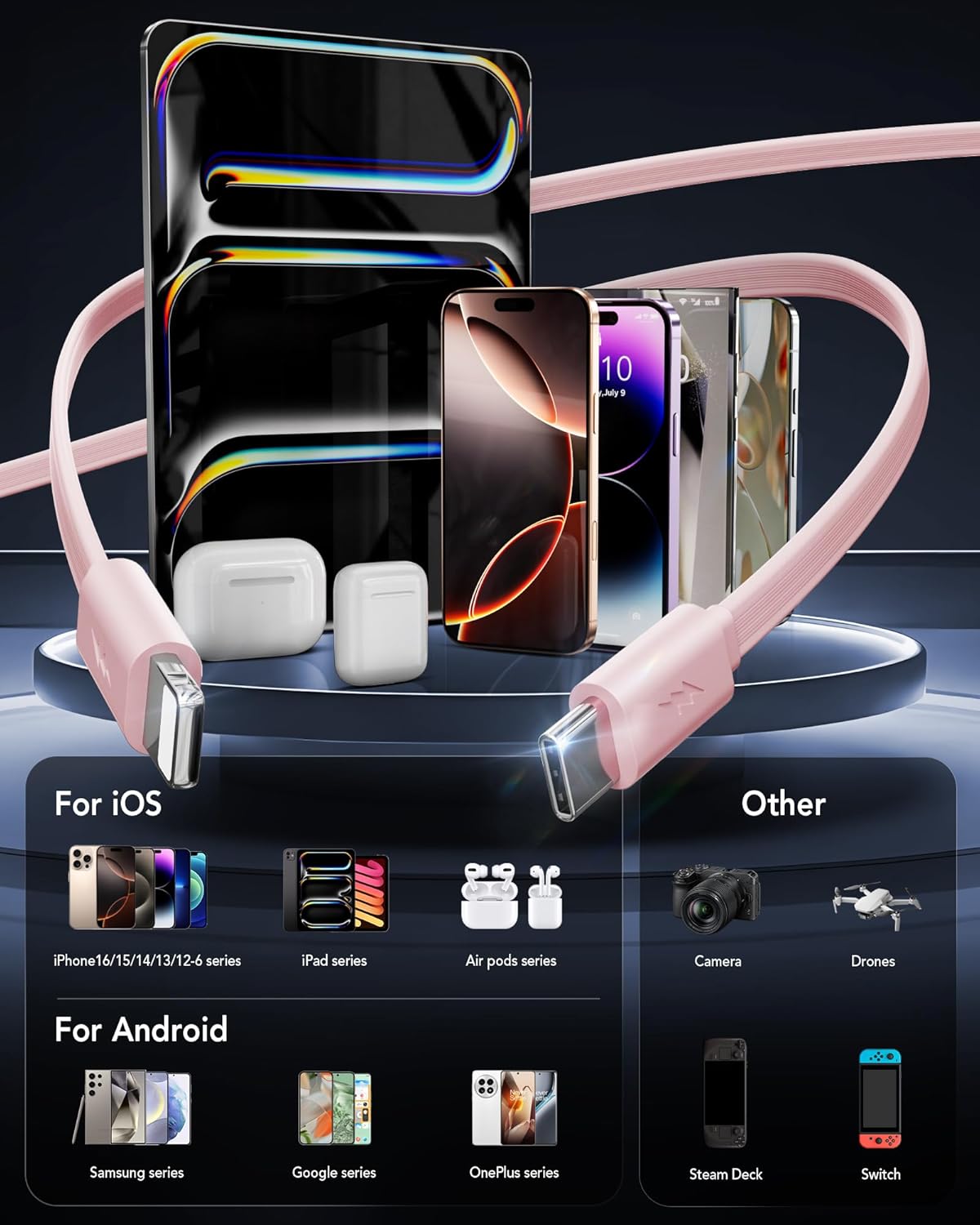 - 【90cm Retractable Cable for Maximum Convenience】 The retractable wall charger block comes with two 90cm retractable cables ,one Lightening and one Type-C. The maximum retractable length of the iphone charging cable is 90cm (35.5 inches), ensuring that you have a retractable charger for all lengths. It is neatly stored, and after unplugging the cable, you only need to gently stretch 1cm to retract the cable.