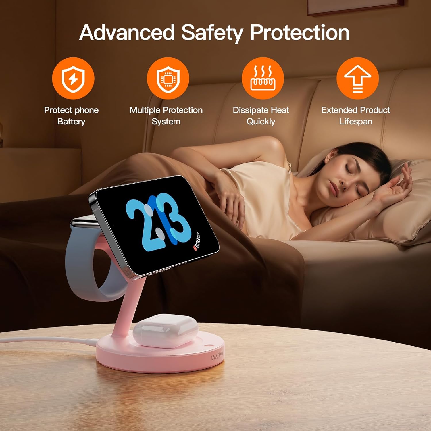 - 【Home of Apple Devices】: 3 in 1 magnetic wireless charger can charge for iPhone,for iWatch,and for AirPods.Please NOTE that the magnetic wireless charger stand only support for iPhone 16/15/14/13/12 series,the phone case only supports magnetic cases or no case,for iWatch10/9/8/7/6/5/4/3/2/SE/Ultra/Ultra 2,for AirPods 2/3/4/Pro/Pro 2(Note:For AirPods 2/3/4 come in 2 versions,make sure to use wireless charging case)Wireless charging station designed for Apple magnetic devices
