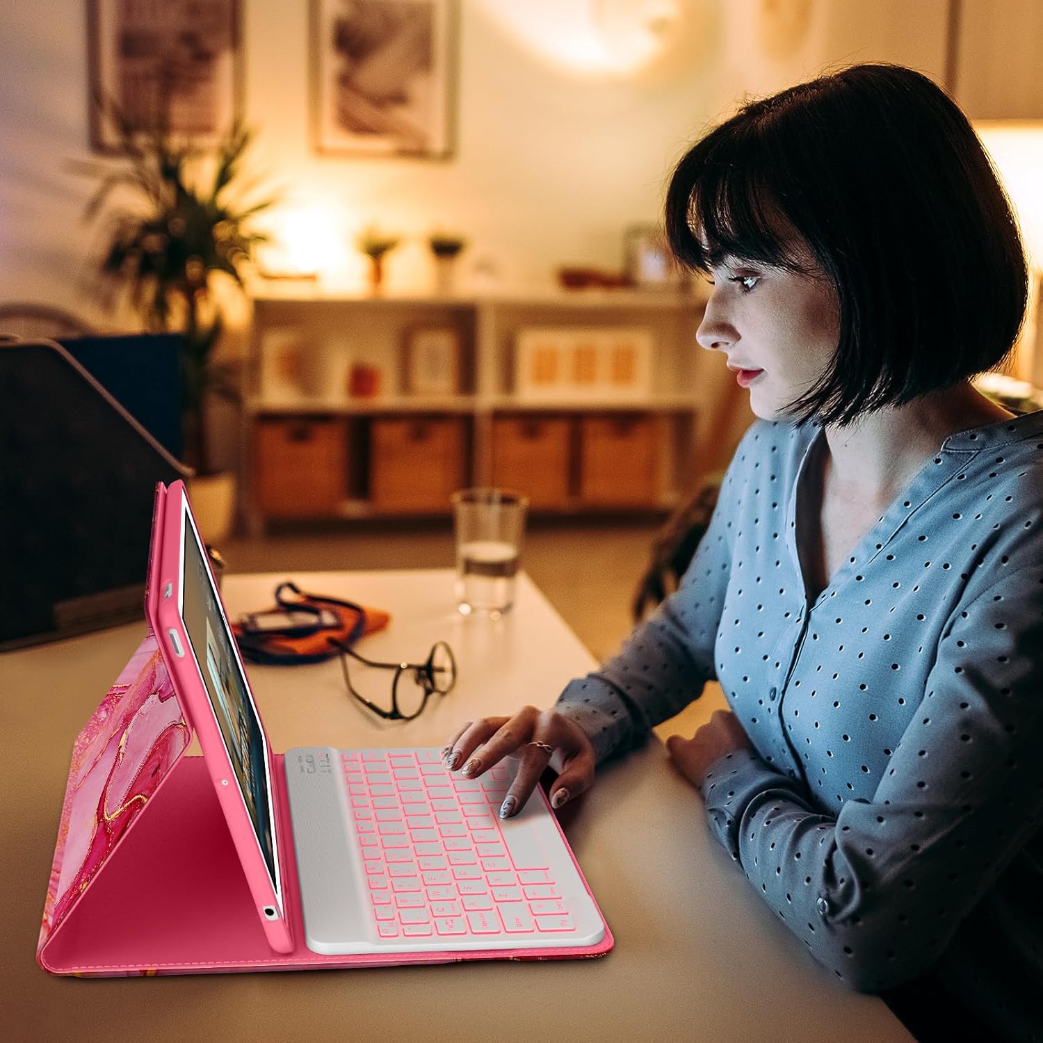 - 【7 Colors Backlit Keyboard】This for iPad 9th generation case with keyboard is designed with laser-etched backlit keys that allow 7 vibrant colors to shine in the dark. Ergonomic and mechanical scissor keys with rebound feature to reduce noise