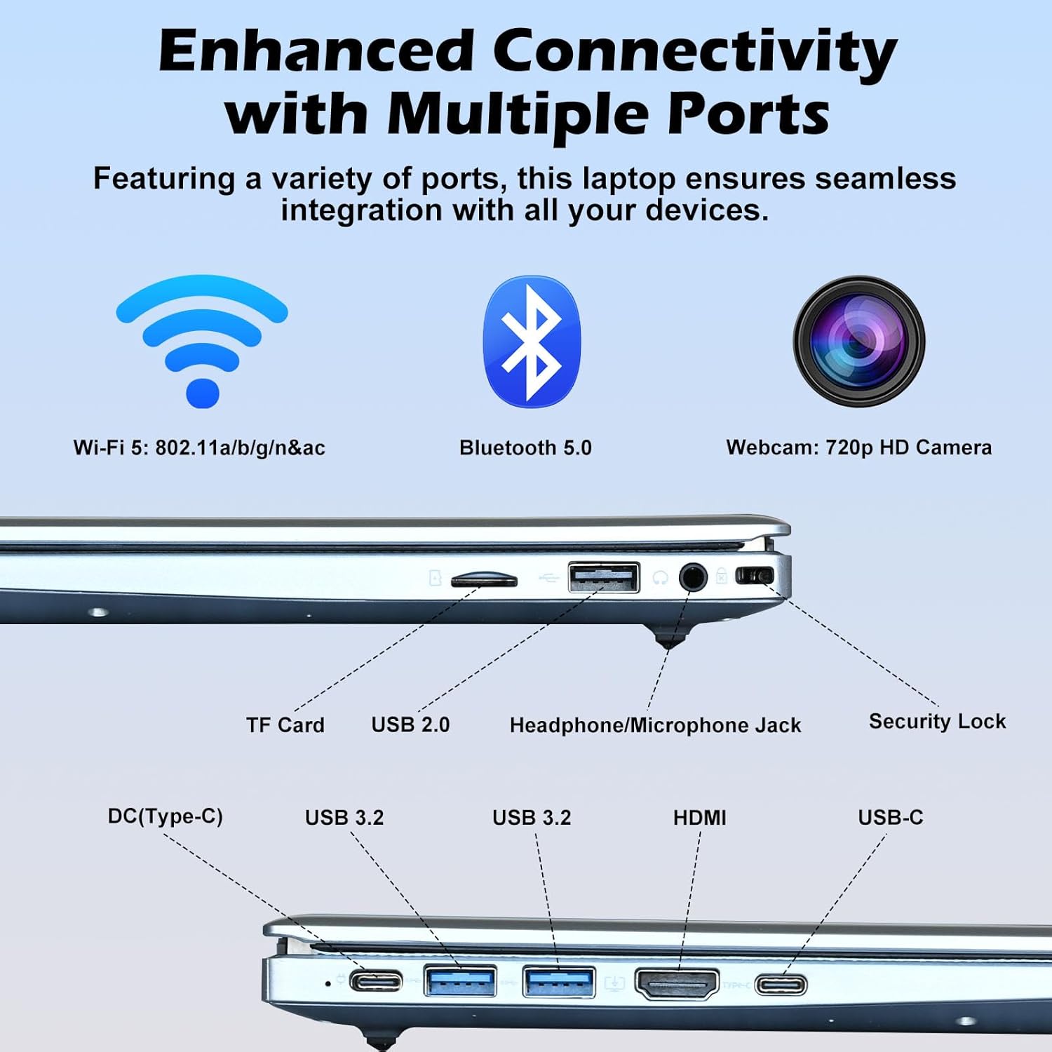 - 【Comprehensive Connectivity Options】Equipped with USB Type-C, USB 3.2, USB 2.0, HDMI, and TF card slots, plus a headphone/mic combo jack. Wi-Fi 5 and Bluetooth 5.0 provide reliable wireless connectivity, making it versatile for business, academic, and everyday use.