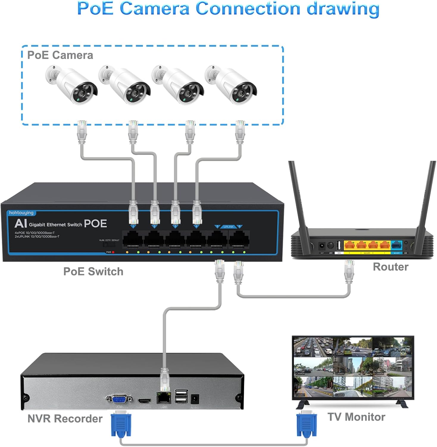 - ใ๐ด๐ฐ๐ต ๐๐ถ๐ด๐ฎ๐ฏ๐ถ๐ ๐ฃ๐ผ๐ ๐ฆ๐๐ถ๐๐ฐ๐ต*๐ฒ๐ฑ๐ชใTotal PoE budget 65W,4ch 1000M PoE port + 2ch 1000M Uplink port, 4รPoE ports Supply up to 30W/port, 2 Gigabit Ethernet Uplink Port for NVR and Routers, etc