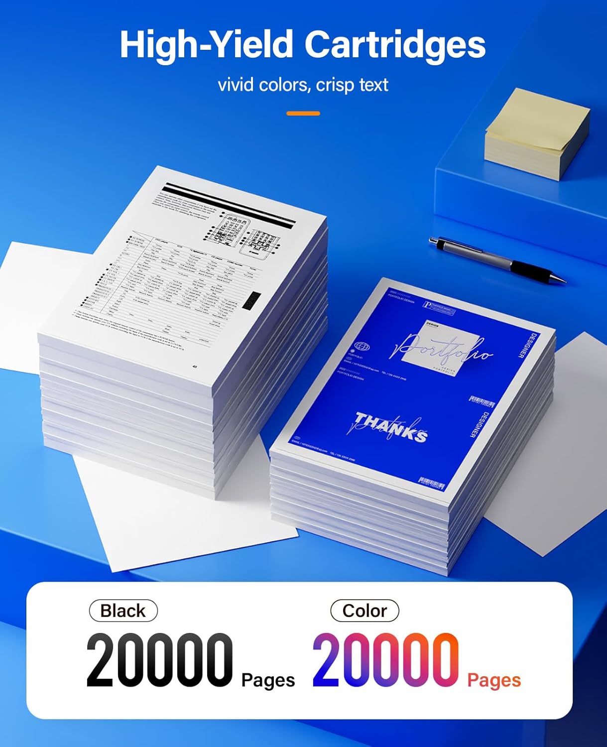 - Page Yield: Up to Black is 20,000 pages per black cartridge and Color is 20,000 Pages per color cartridge (Letter/A4, at 5% Coverage).