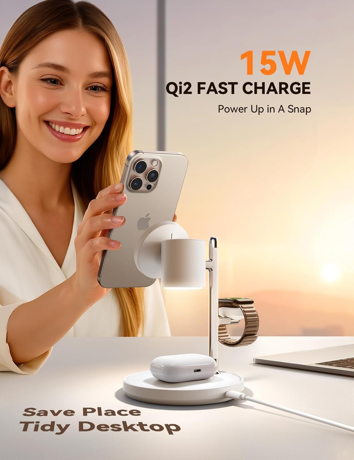 - Innovative 4-in-1 Charging Station for Apple Ecosystem: JOYROOM Qi2.0 Certified Super Fast Wireless Charger for iPhones, offer 2X faster charging speed than ordinary 7.5W Magsafe chargers, features with a 3W fast wireless charging spot for Apple watch series, plus a 5W fast wireless charging base for AirPods.Featuring JOYROOM innovative smart interactive warm/cold adjustable night-lamp, set the perfect ambiance for comfort