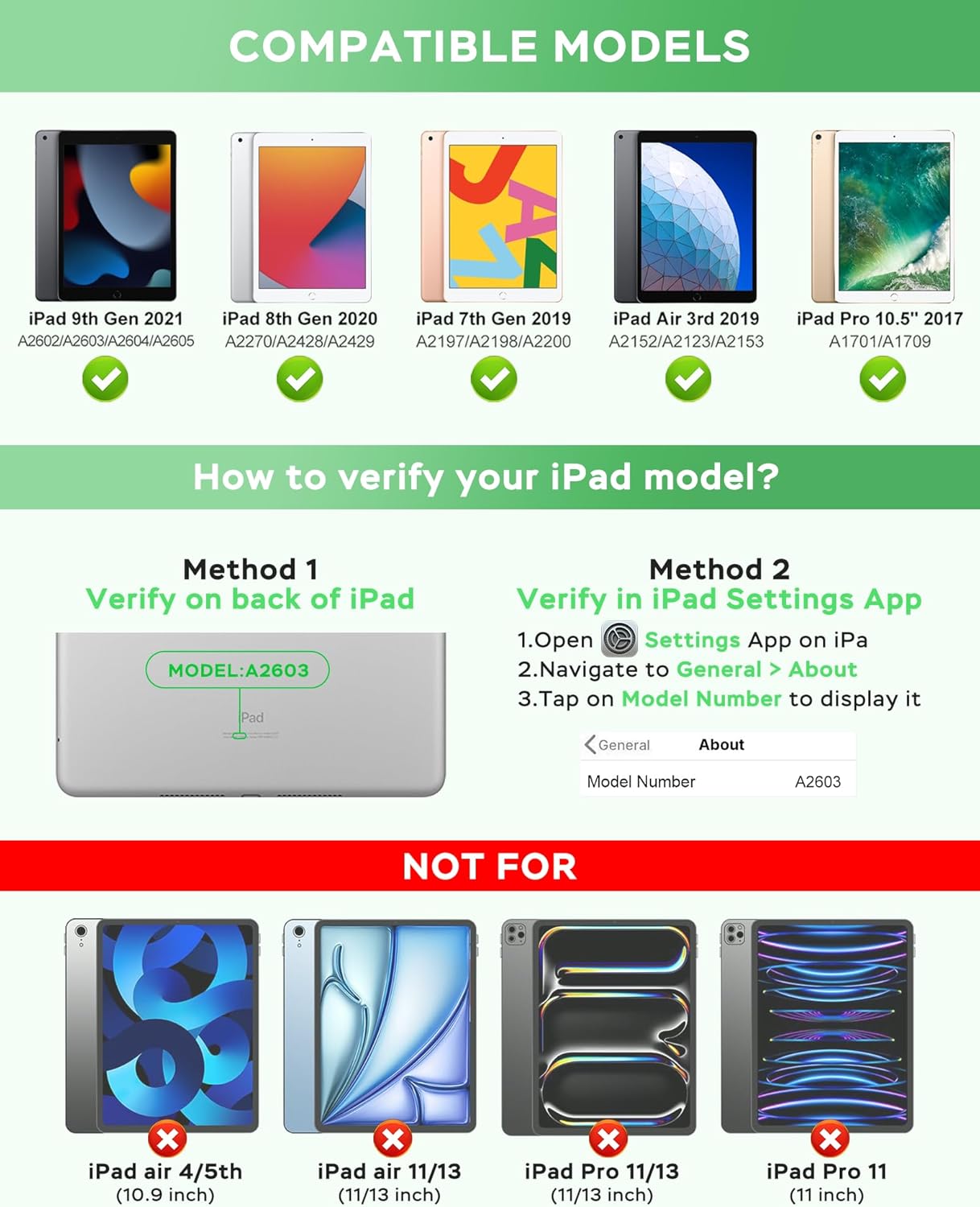 - Compatible Devices : iPad 7th Generation 2019 - 10.2 inch(Model Number:A2197/A2198/A2200), iPad 8th Generation 2020 - 10.2 inch(Model Number:A2430, A2270, A2428, A2429), iPad 9th Generation 2021 - 10.2 inch(Model Number:A2602, A2603, A2604, A2605), iPad Air 3rd 2019 - 10.5 inch(Model Number:A2152, A2123, A2153), iPad Pro 2017 - 10.5 inch(Model Number:A1701, A1709) iPad 7th Generation 2019 - 10.2 inch(Model Number:A2197/A2198/A2200), iPad 8th Generation 2020 - 10.2 inch(Model Number:A2430, A2270, A… See more