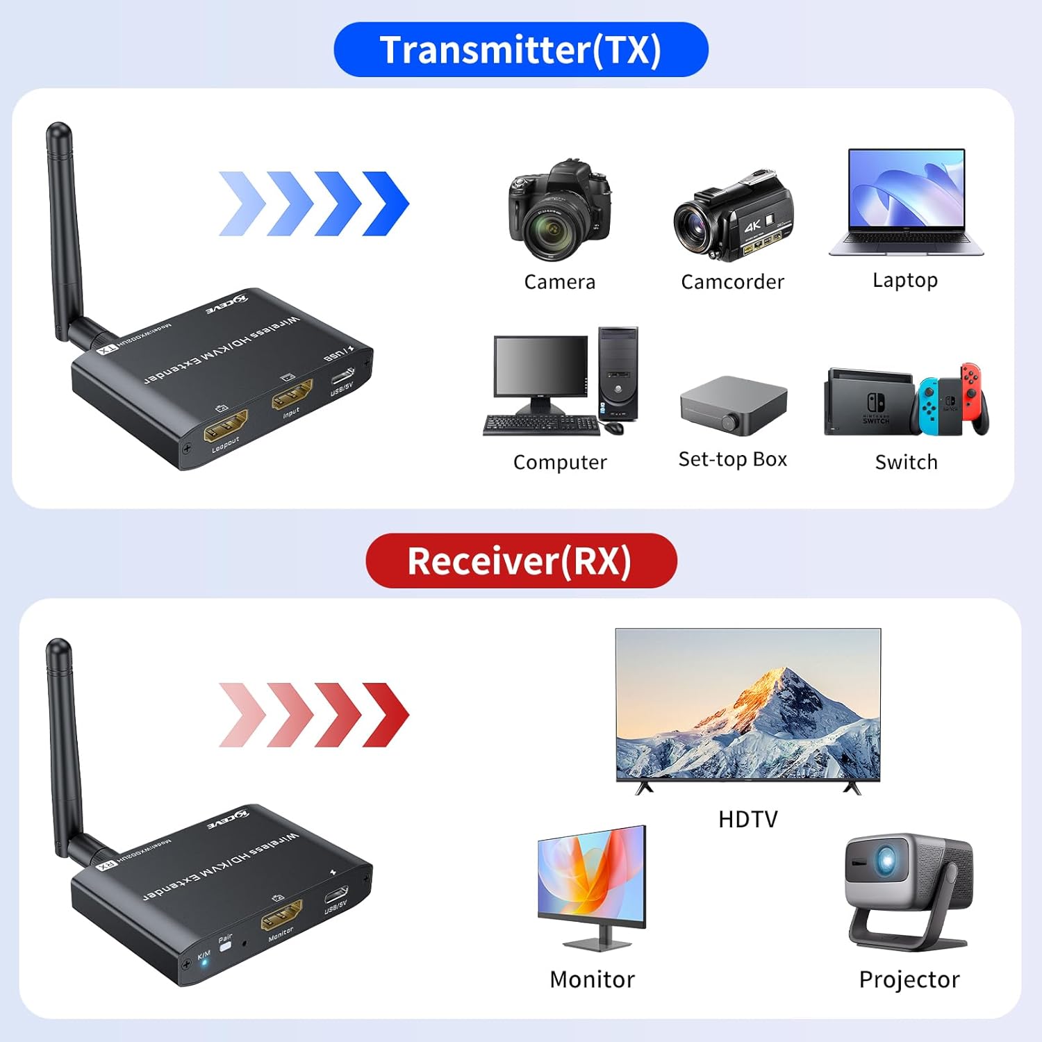 - 【200M/660FT Wireless HDMI Transmitter and Receiver】KCEVE Wireless HDMI transmitter and receiver with low latency and long transmission distance. 200M/660FT for Outdoor Open Area, 150M/500FT for Indoor without barriers, 30M/100FT for Indoor through a wall. Do not put two walls between the wireless HDMI transmitter and the wireless HDMI receiver. It is best to use it in an obstacle-free space to avoid reducing efficiency