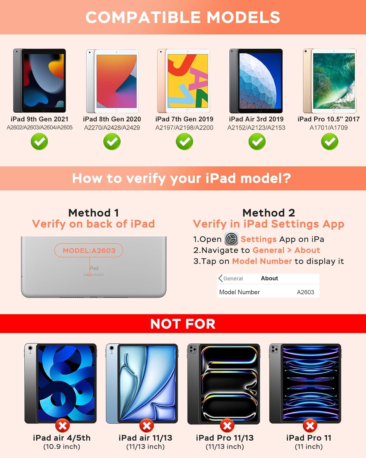 - 【For ipad Case with Keyboard 10.2/10.5 Inch】This keyboard case compatible with iPad 9th Generation 10.2inch 2021(Model Number:A2602/A2603/A2604/A2605), compatible with iPad 8th Generation 10.2inch 2020(Model Number:A2270/A2428/A2429/A2430), compatible with iPad 7th Generation 10.2inch 2019(Model Number:A2200/A2197/A2198), compatible with iPad Air 3rd Generation 10.5inch 2019(Model Number:A2123/A2152/A2153/A2154) and compatible with iPad Pro 10.5inch 2017(Model Number: A1701/A1709/A1852). Please check the model number starting with "A" on the back of your tablet before purchasing