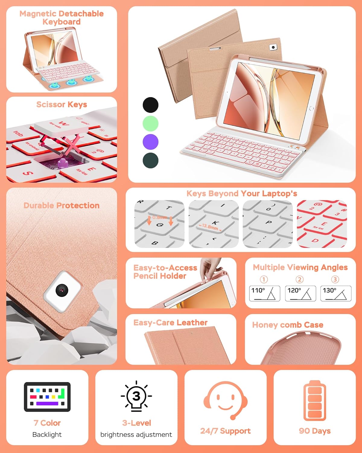 - 【Adjustable 7 Colors Backlit Keyboard】This for ipad 8th generation case with keyboard designed with laser-etched backlit keys that allow 7 vibrant colors to shine in the dark, illuminated typing is more fun and easy. Ergonomic and mechanical scissor keys with rebound feature to reduce noise, enjoy comfortable typing even long hours