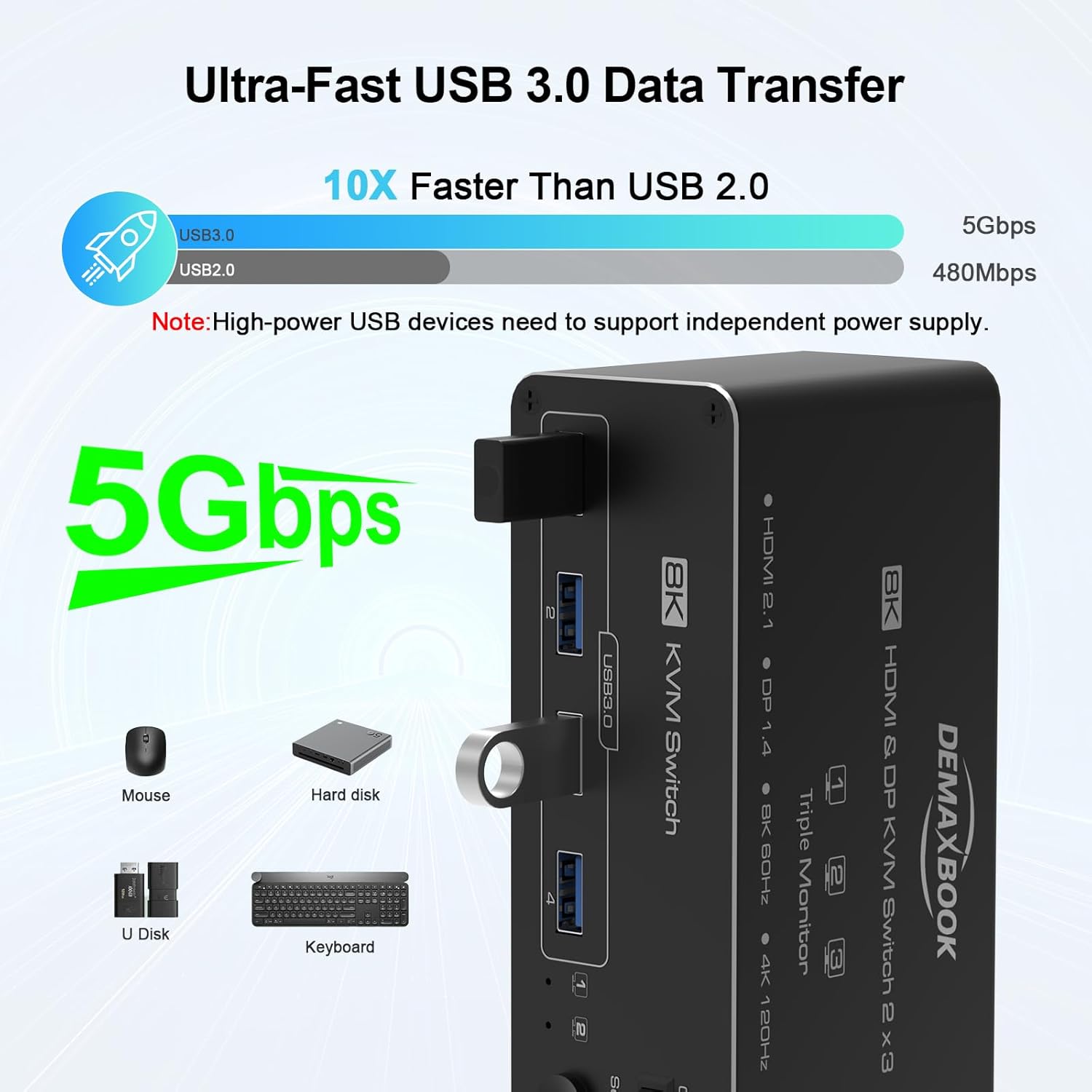 - 【USB 3.0 KVM switch 3 Monitors】Equipped with 4 USB 3.0 ports, this Triple monitor HDMI+2 Displayport KVM switch supports ultra-fast data transfer speeds of up to 5Gbps, 10 times faster than USB 2.0. Share USB peripherals like keyboards, mice, printers, and external drives between two computers seamlessly.Note:The USB input port must be connected to the computer, otherwise the keyboard and mouse will not be recognized.