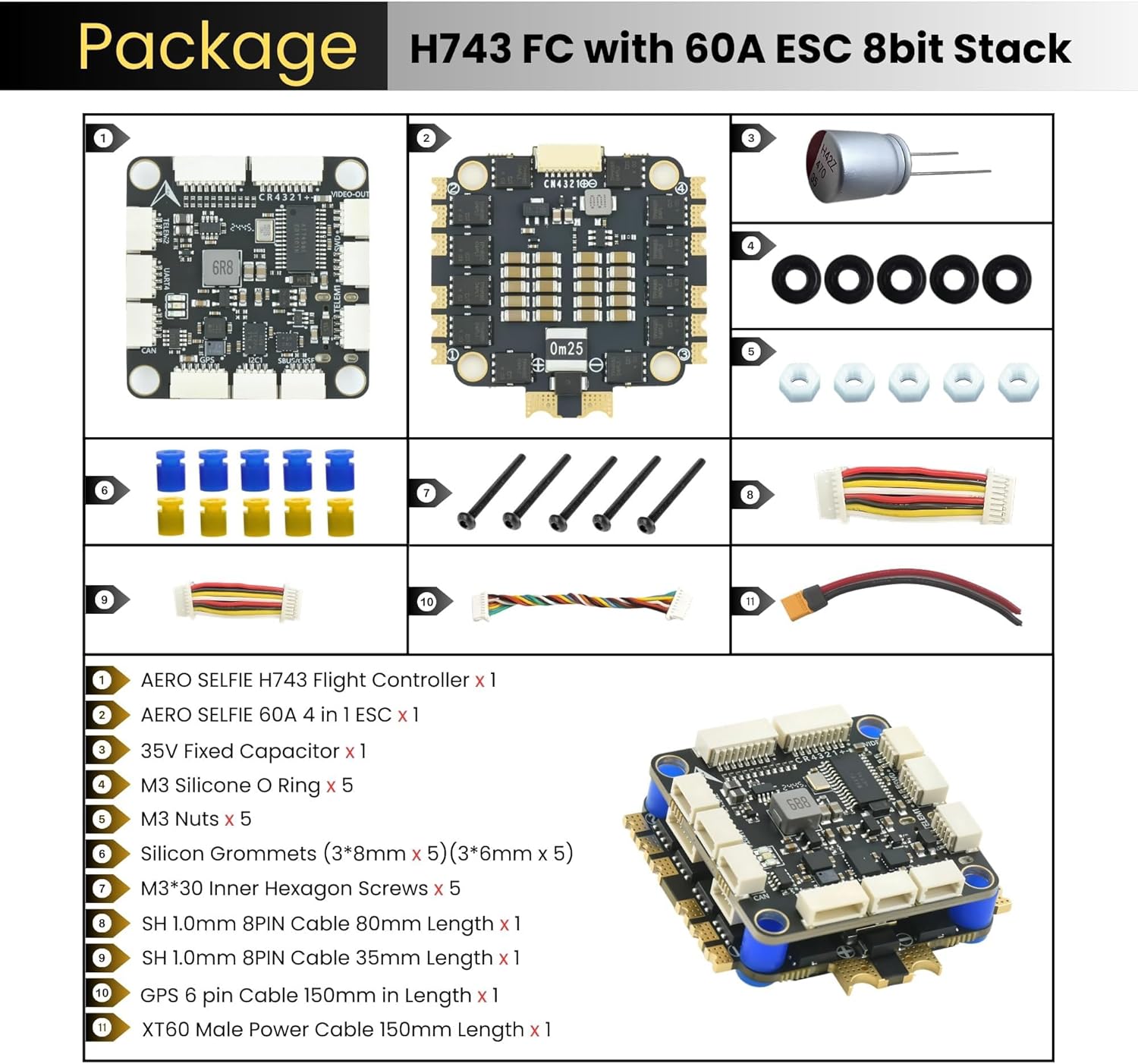 - Included Components : 35V Fixed Capacitor x 1, 8PIN 1.0mm Cable 80mm Length x 1 , 8PIN 1.0mm Cable 30mm Length x 1, GPS 6 pin Cable 150mm in Length x 1, Nuts, Grommets, Screws and O rings, XT60 Male Power Cable 150mm Length x 1 35V Fixed Capacitor x 1, 8PIN 1.0mm Cable 80mm Length x 1 , 8PIN 1.0mm Cable 30mm Length x 1, GPS 6 pin Cable 150mm in Length x 1, Nuts, Grommets, Screws and O rings, XT60 Male Power Cable 150mm Length x 1