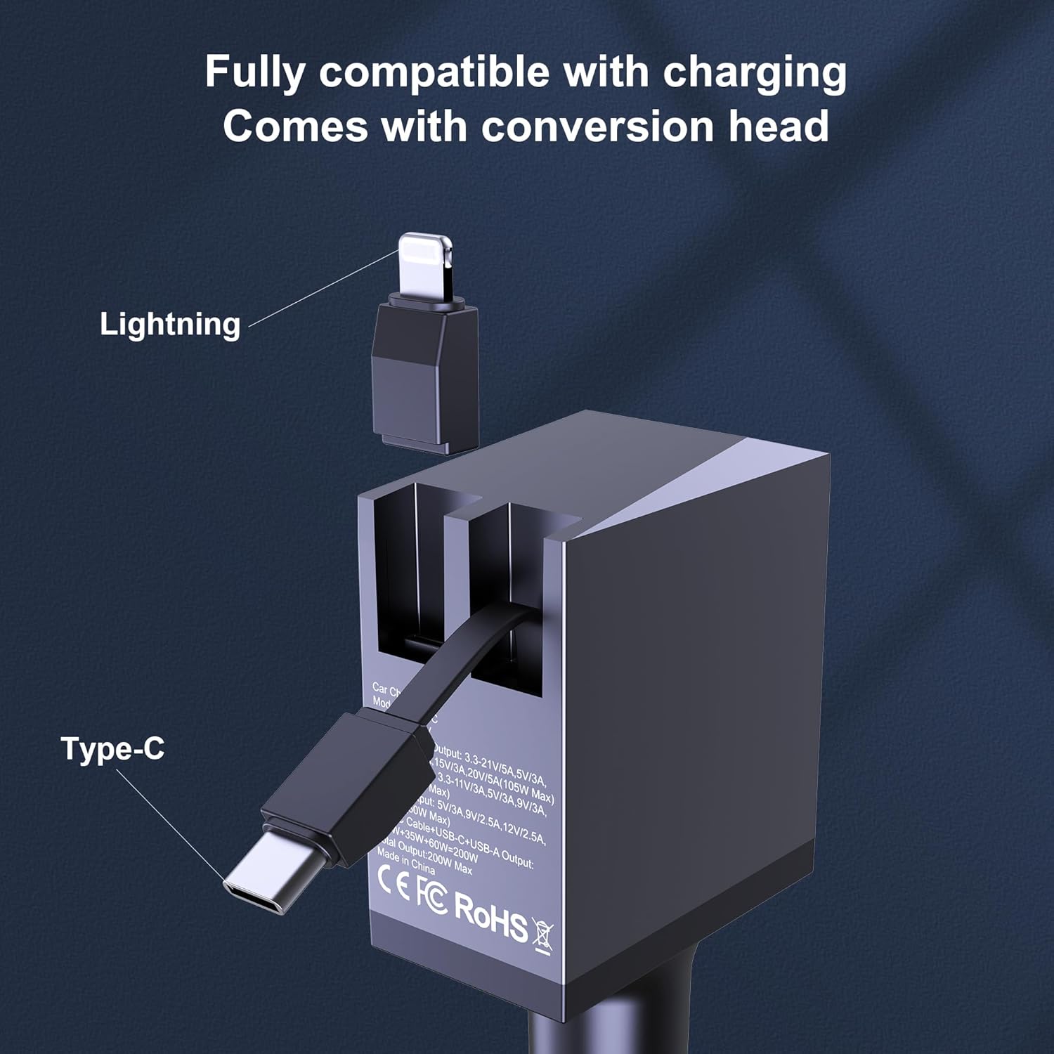 - Retractable USB C Car Charger: Built-in 2.3ft retractable USB C cable delivers 105W super charging, combined with 35W USB-C and 60W USB-A ports for 200W total power output, rapidly charging laptops, phones, tablets, or other devices simultaneously