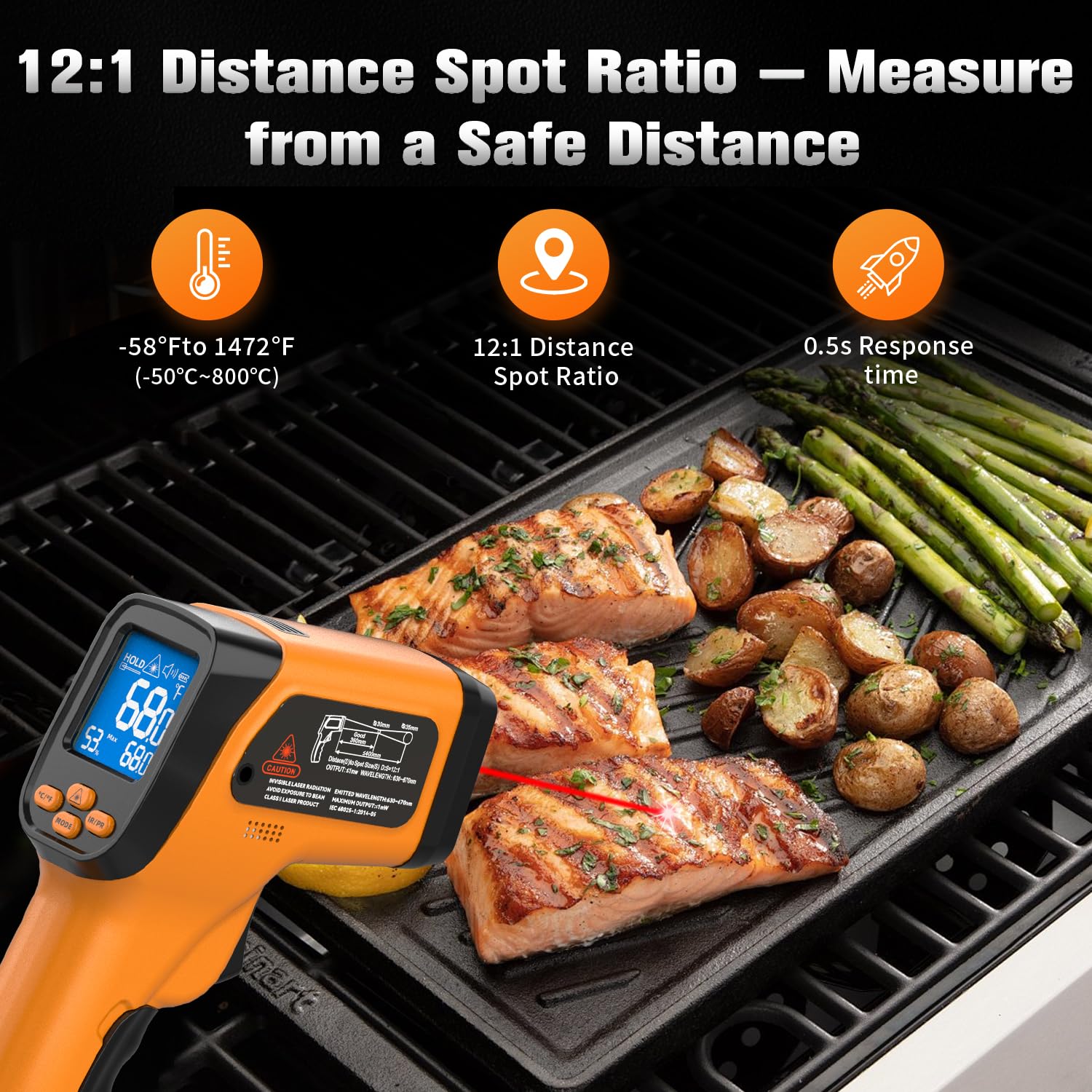 - Rapid & Accurate Performance – 0.5 s response time with a 12:1 distance-to-spot ratio and adjustable emissivity (0.1–0.99), ensuring precise results on grills, machinery, kilns, and metal castings.