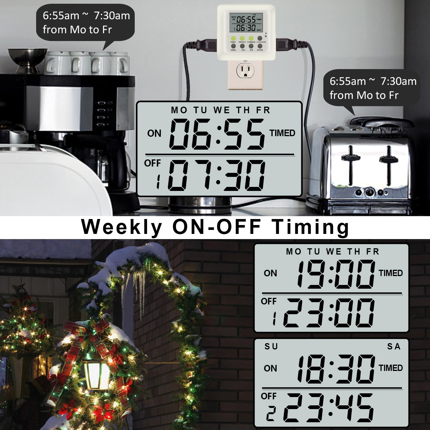 - Feature 1: This timer outlet offers 3 weekly/daily timing programs, with which your will be able to have different on-off schedules for different days or day combinations