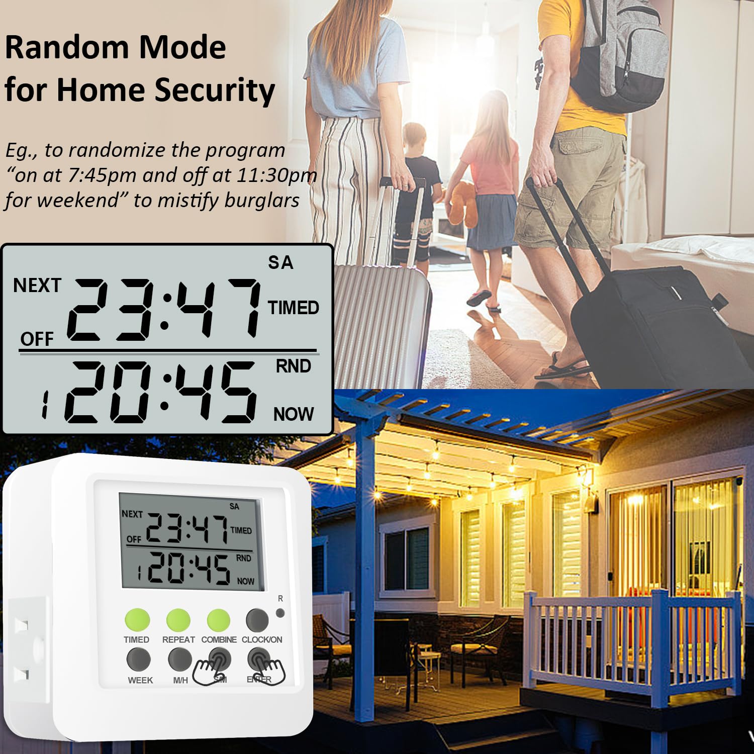- Other Features: two grounded outlets(controlled simultaneously, the total current of the two outlets do not exceed 15 amps); random mode for lights to make your house look occupied to mystify burglars