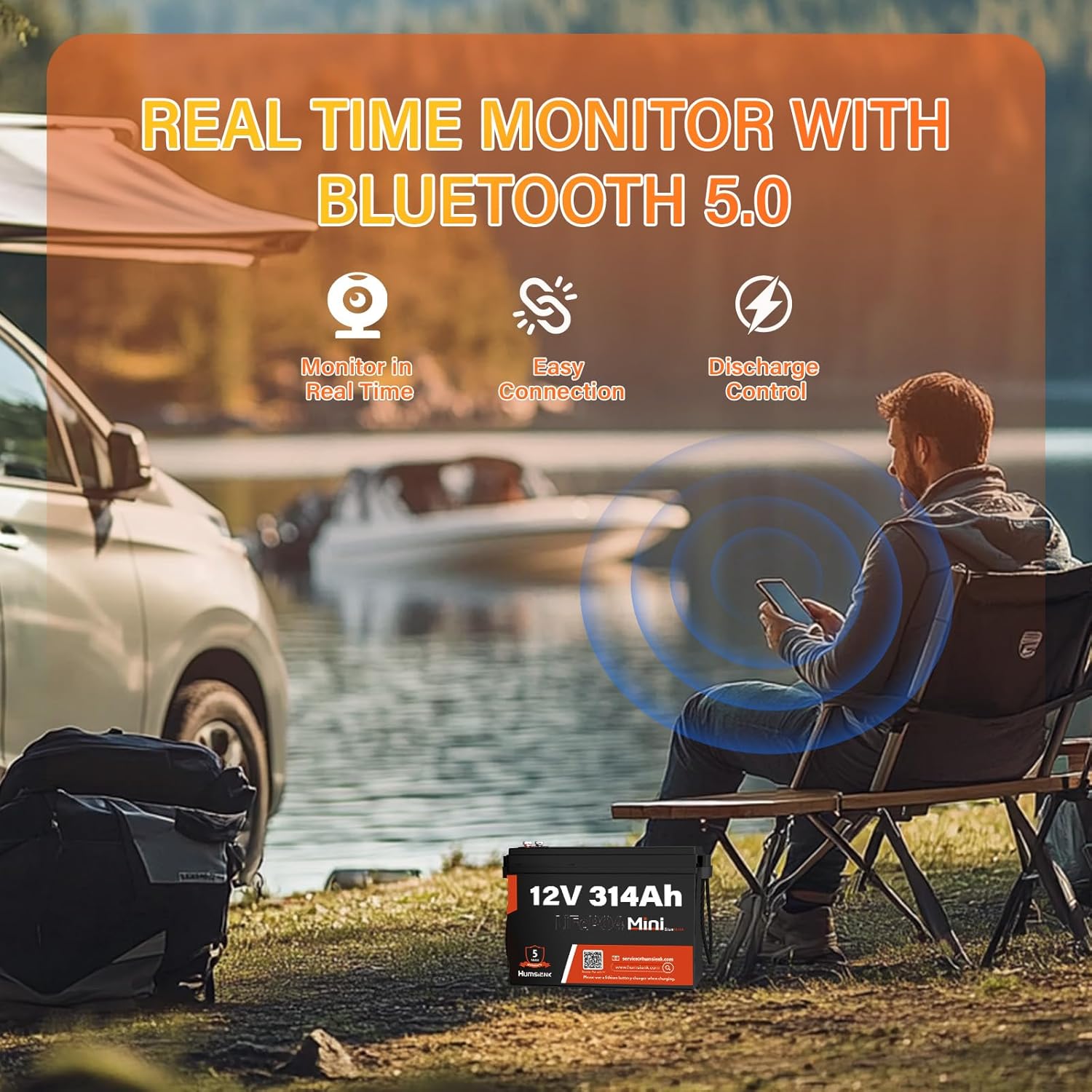 - 【Real Time Monitor with Bluetooth APP】HumsiENK 12V 314Ah smart LiFePO4 lithium battery (1 Pack) has an upgraded version of smart BMS built in, connected with Bluetooth 5.0 module, allowing you to monitor battery parameter information in real time via APP. You can read important information such as battery voltage, current, battery capacity, etc. at any time. Bluetooth connection range: no more than 15 meters away from the battery【Note】The Humienk app is constantly being updated and and is available to download from the App Store for iOS users. Android users, please contact us to obtain a QR code for downloading the application.