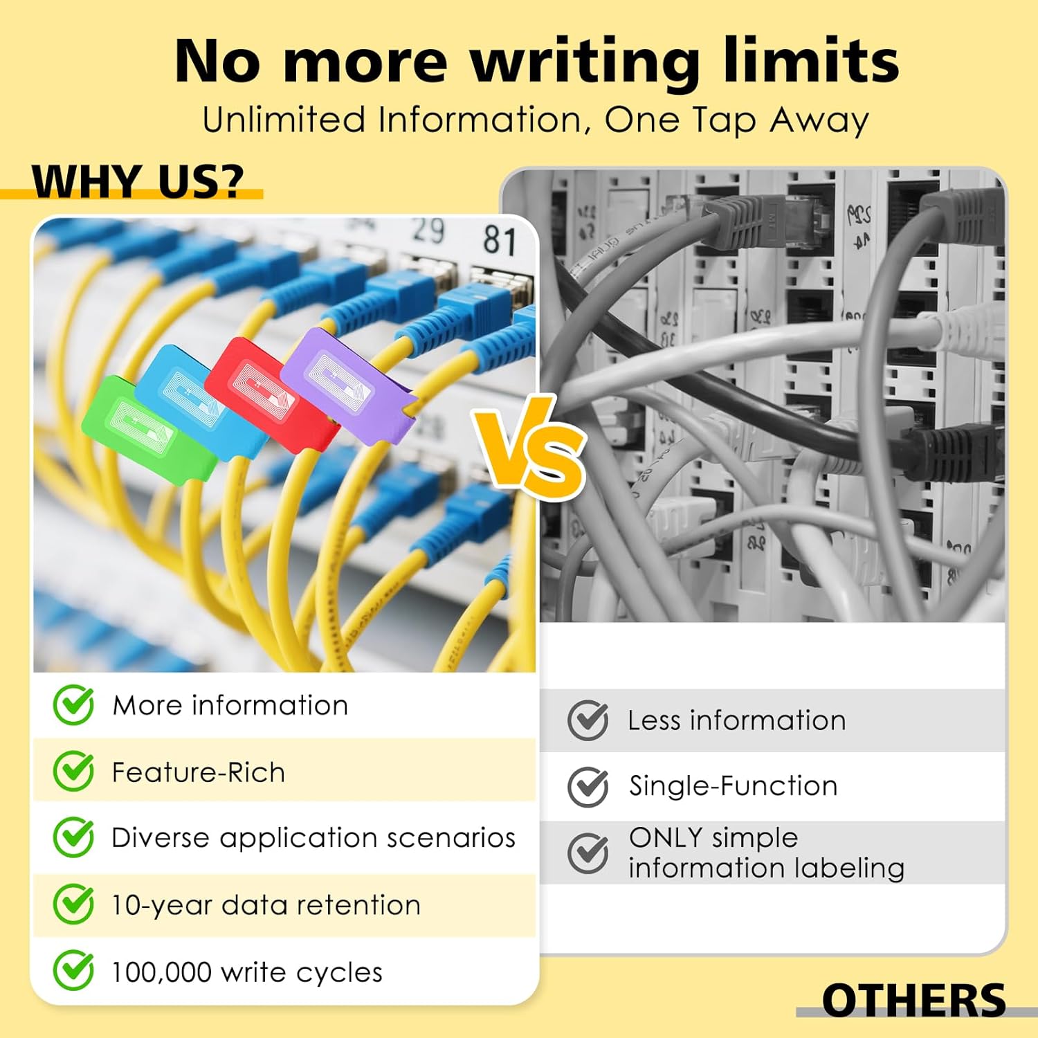 - Smart Cable Identification: Ditch basic cable labels that only fit one word! Our smart NFC cord labels let you store way more—text, URLs, music, detailed user guides, etc. Just tap your unlocked phone (iOS 13+/Android 10+) to the NFC tags for instant info. This set includes 24 cable labels + 24 NFC stickers (1:1 Pairing). Choose from 3 shapes (Rectangle, Oval, Mix) to fit your needs.