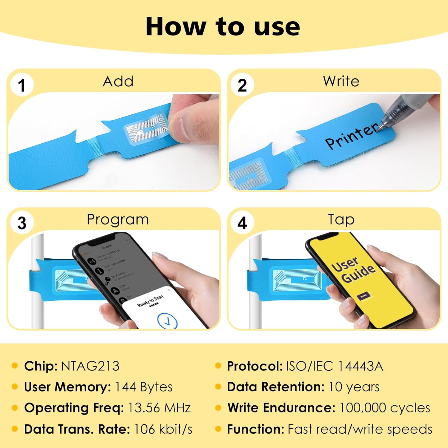 - NFC Tags Stickers: Built-in the NTAG213 chip, deliver smooth, reliable performance. With 144 bytes memory, the NFC cards store all you need: text, URLs, user guides, or data effortlessly! Plus, our blank NFC tag handle up to 100,000 reads/writes and last up to 10 years. Easy to use—great for simplifying daily tasks or smart home.