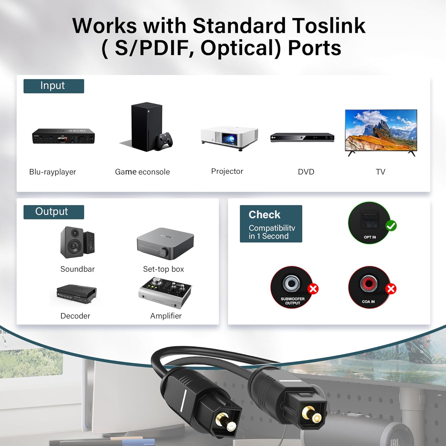 - Kind reminder: Please confirm that your device has Toslink / S/PDIF / Optical ports before purchasing to ensure compatibility----Optical audio cables are for one-way digital signal transmission only and do not support analog audio, do not attempt to plug into non-optical ports
