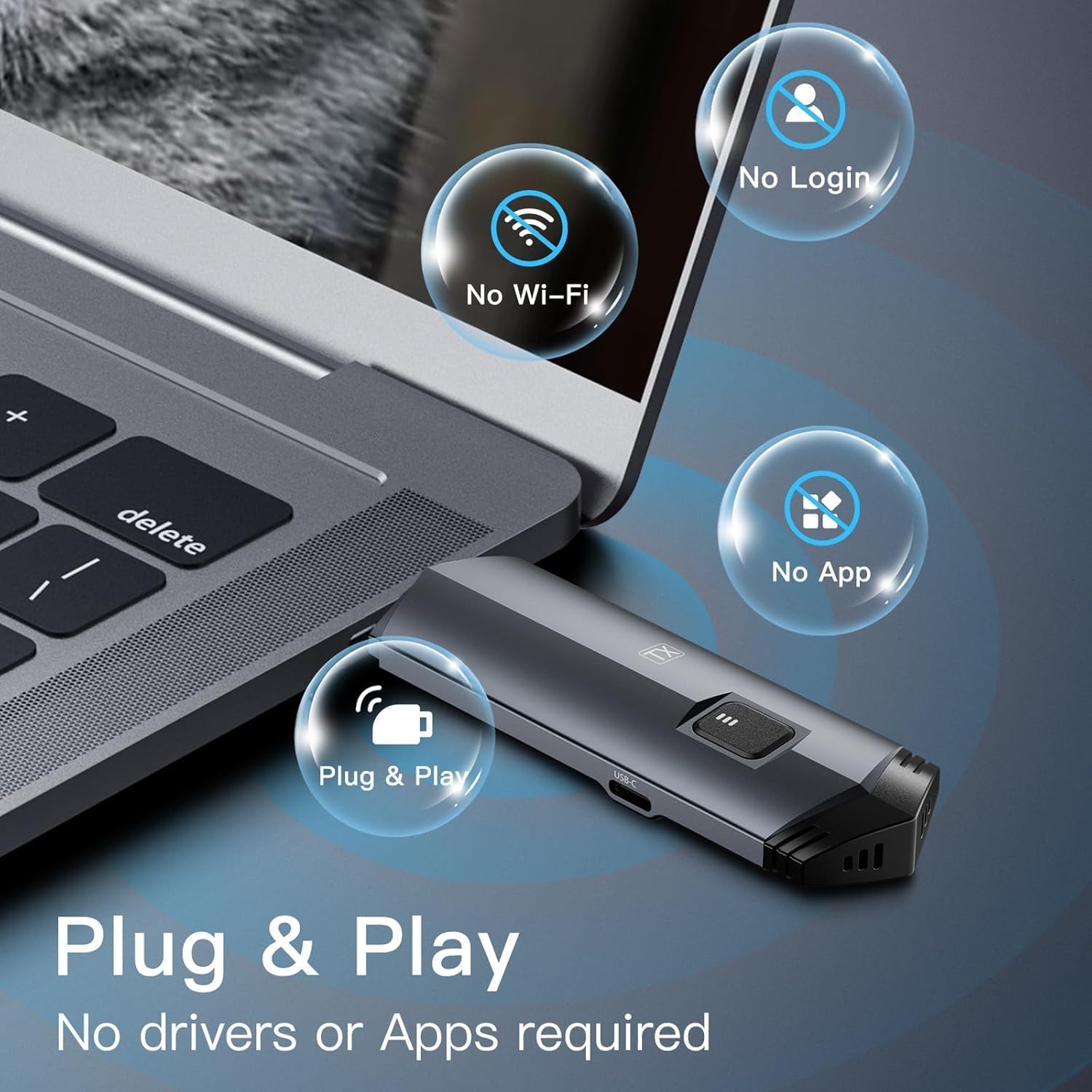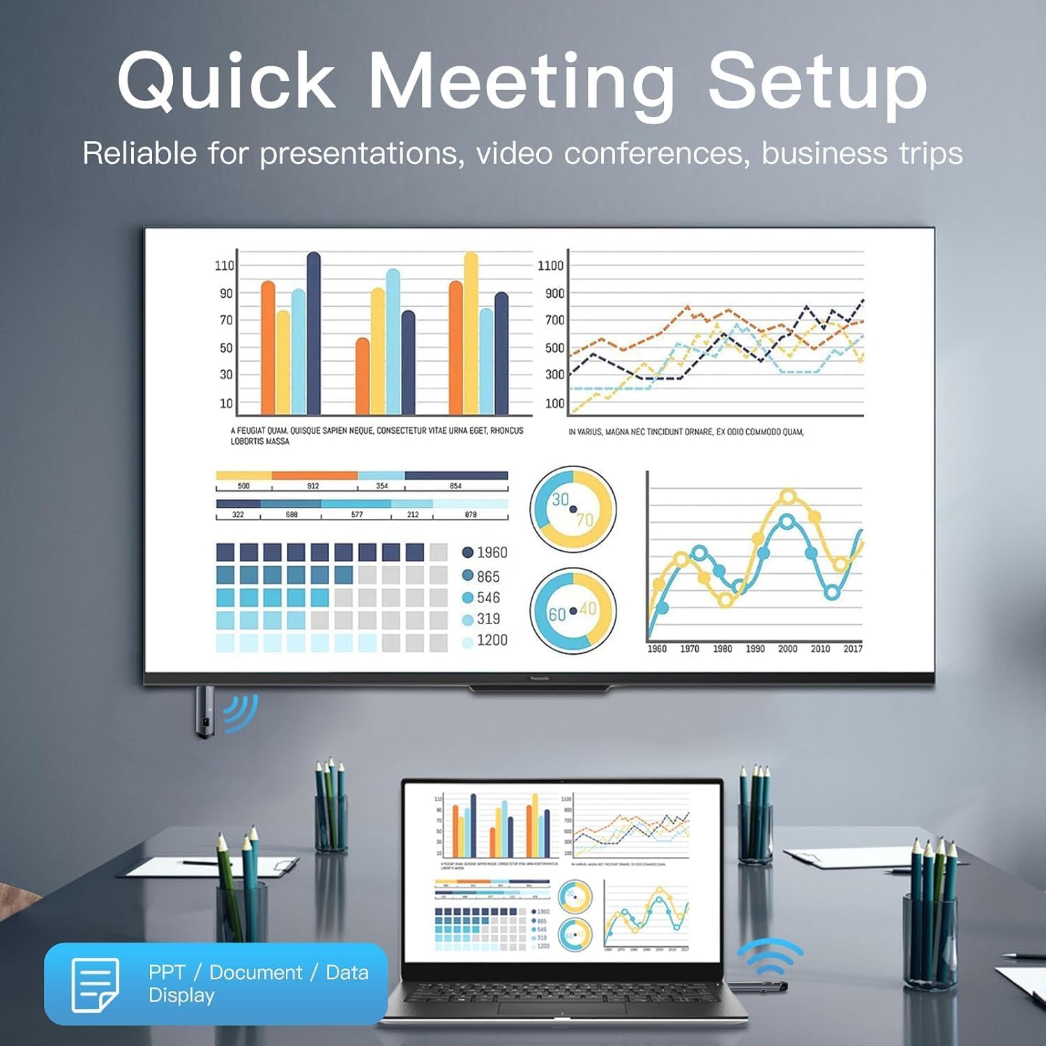 - Wireless HDMI Anytime, Anywhere: Tired of HDMI cable tangles? Our product offers a hassle-free solution. Pre-paired at the factory, it automatically connects within 10 seconds after startup, providing a plug-and-play experience with no need for apps or drivers. Say goodbye to the limitations of traditional HDMI cables, like wiring trouble, aesthetic concerns, and short transmission distances. Its compact, USB stick-like design ensures easy carrying for travel and business trips.