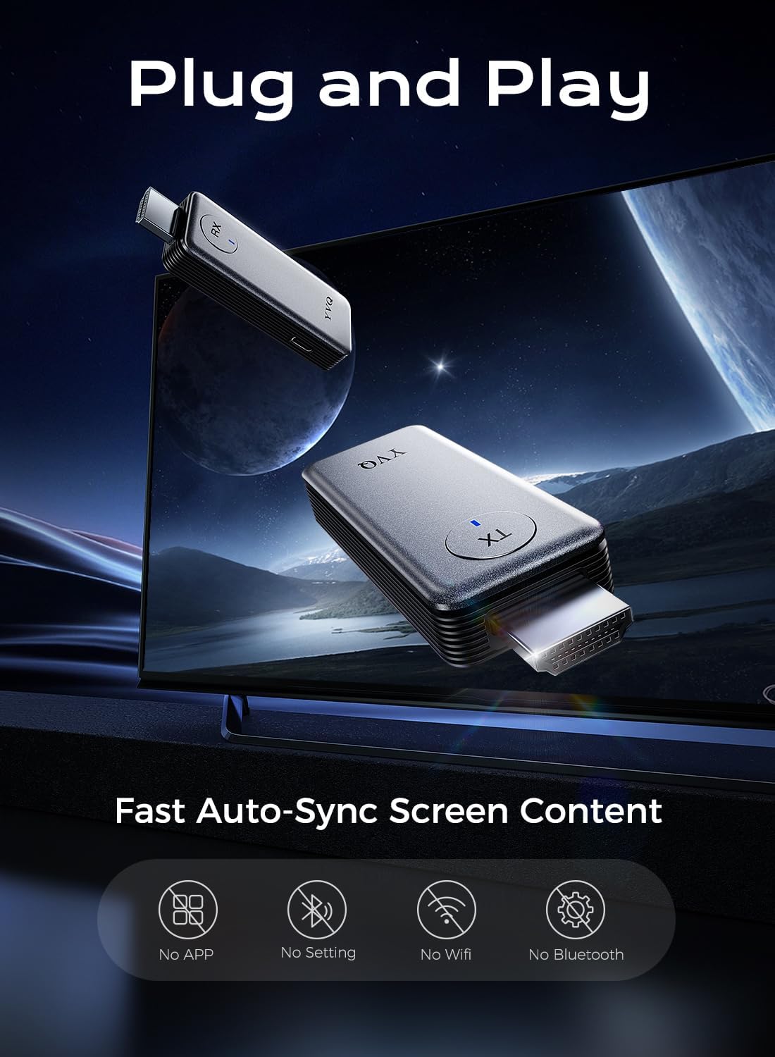 - 【Plug-and-Play, Simple and Efficient】YVQ wireless HDMI transmitter and receiver support plug-and-play functionality, eliminating the need for traditional Bluetooth, Wi-Fi, or app setups. Quickly connect without the hassle of configuration. Say goodbye to tangled cables and enjoy the convenience of wireless transmission, keeping your workspace or home tidy.