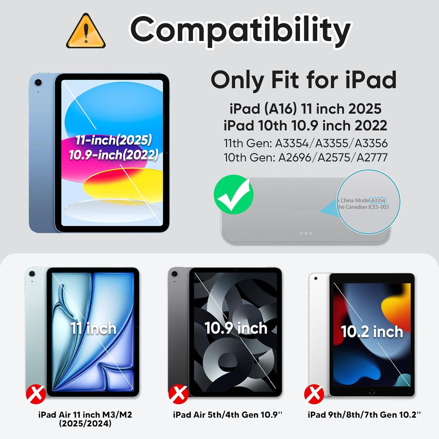 - FOR IPAD 11TH/10TH GEN CASE — Exclusively designed Full-Body Drop Protection Case for iPad (A16) 11th Generation 11 inch/ 10th Generation 10.9 inch 2025/2022 Released(Model Number: A3354/A3355/A3356 A2696/A2757/A2777). NOT fits other Generations iPad. Please confirm the product before purchase