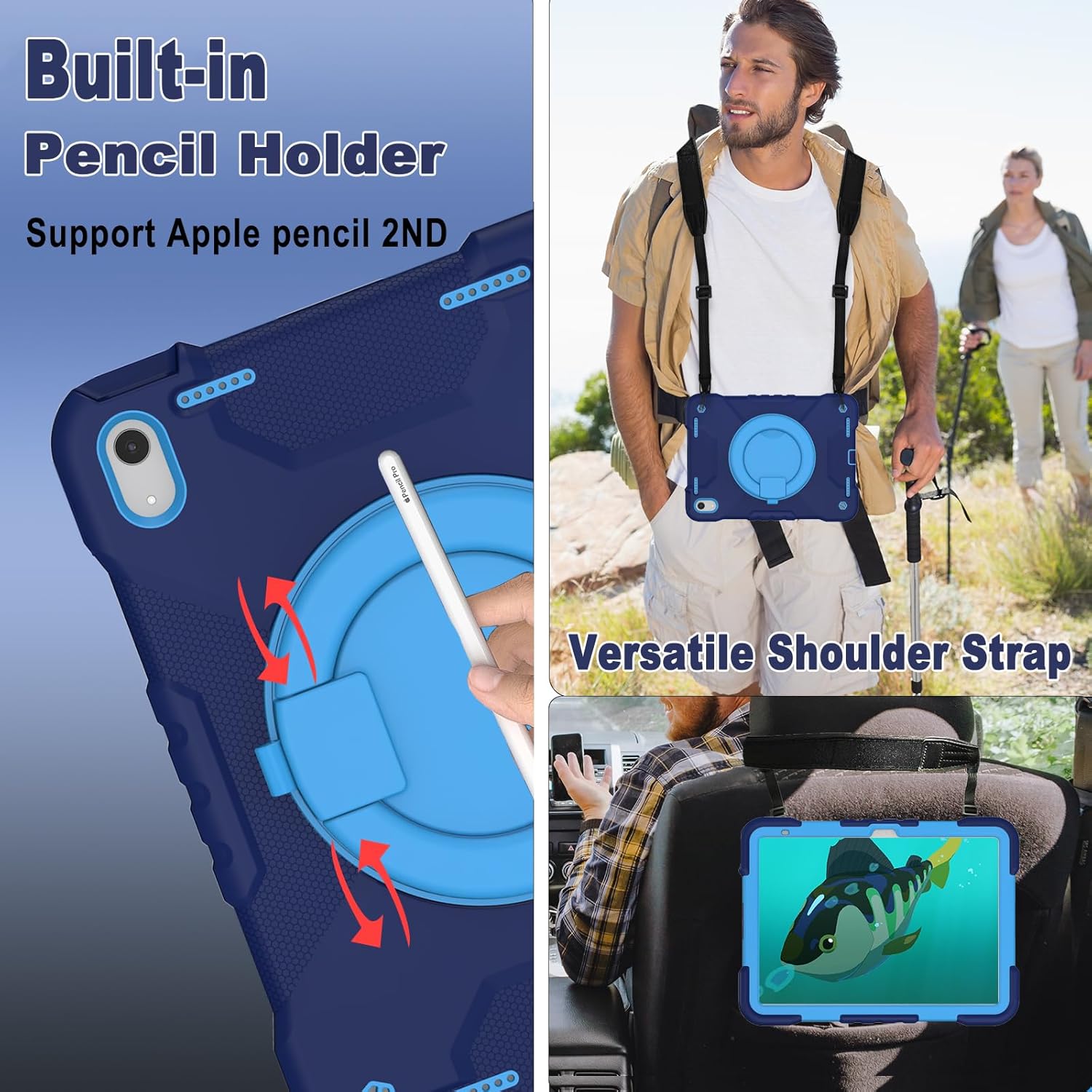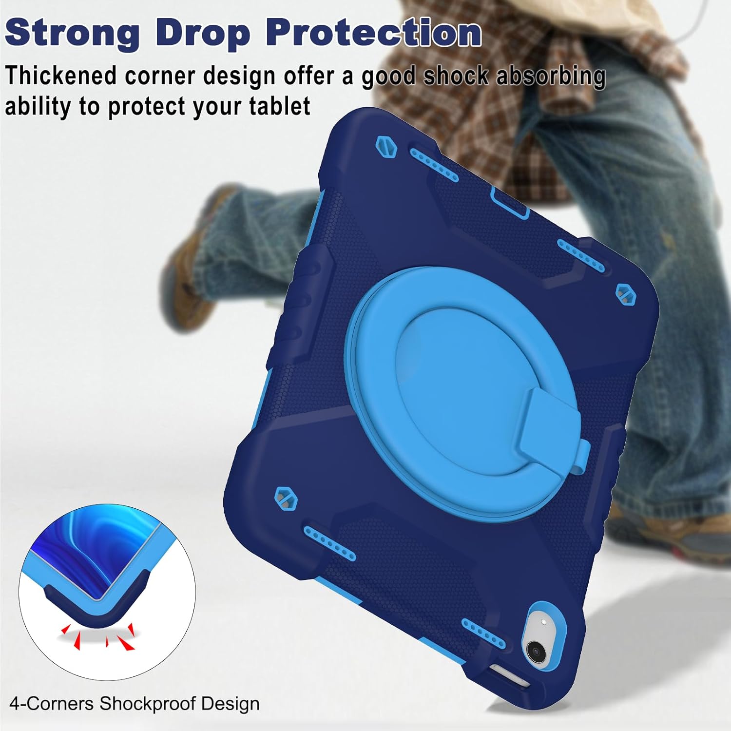 Case for iPad (A16) 11th Generation 11 inch 2025/10th Generation 10.9 inch 2022, Heavy Duty Shockproof Kids Protection Cover with Pencil Holder/360° Rotating Stand/Handle/Shoulder Strap, Navy Blue