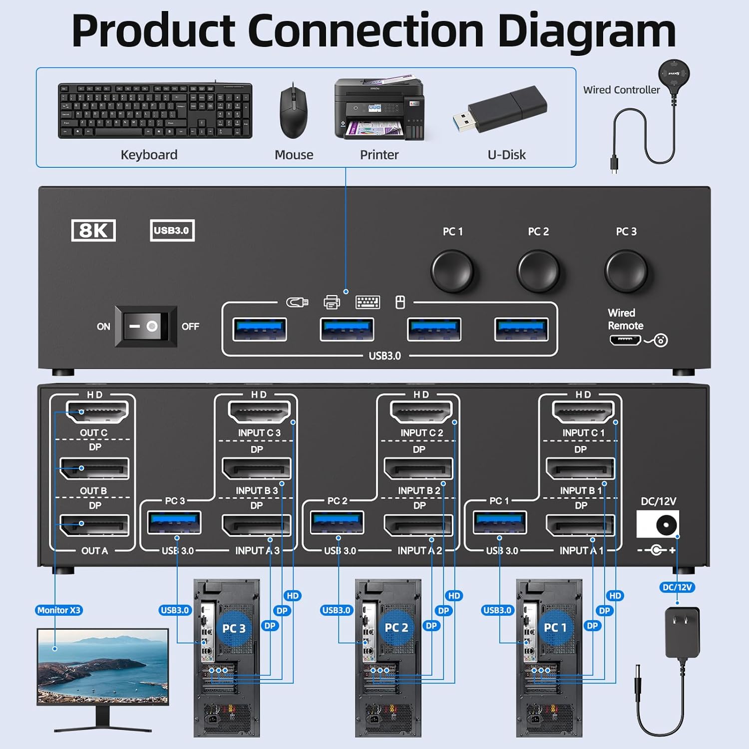HDMI+2Displayport KVM Switch 3 Monitors 3 Computers 8K@60Hz 4K@144Hz,Triple Monitor KVM Switches with 4 USB3.0 Port for USB Devices,Wired Remote,Power Adapter and USB Cables Included.