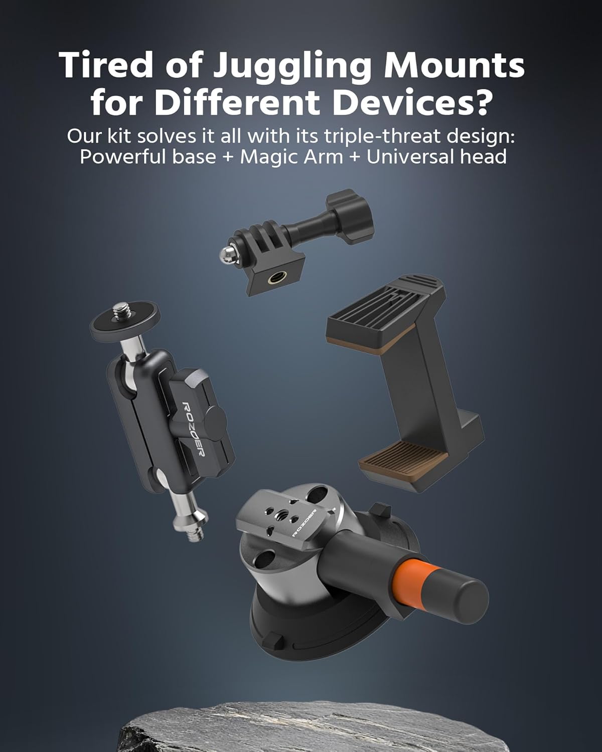 - 【PRO-GRADE MAGIC ARM】Includes 97.4mm/3.84" aluminum alloy flexible arm with dual ball heads. Achieve impossible angles - perfect for overhead shots, dashboard cams, and creative vlogging.