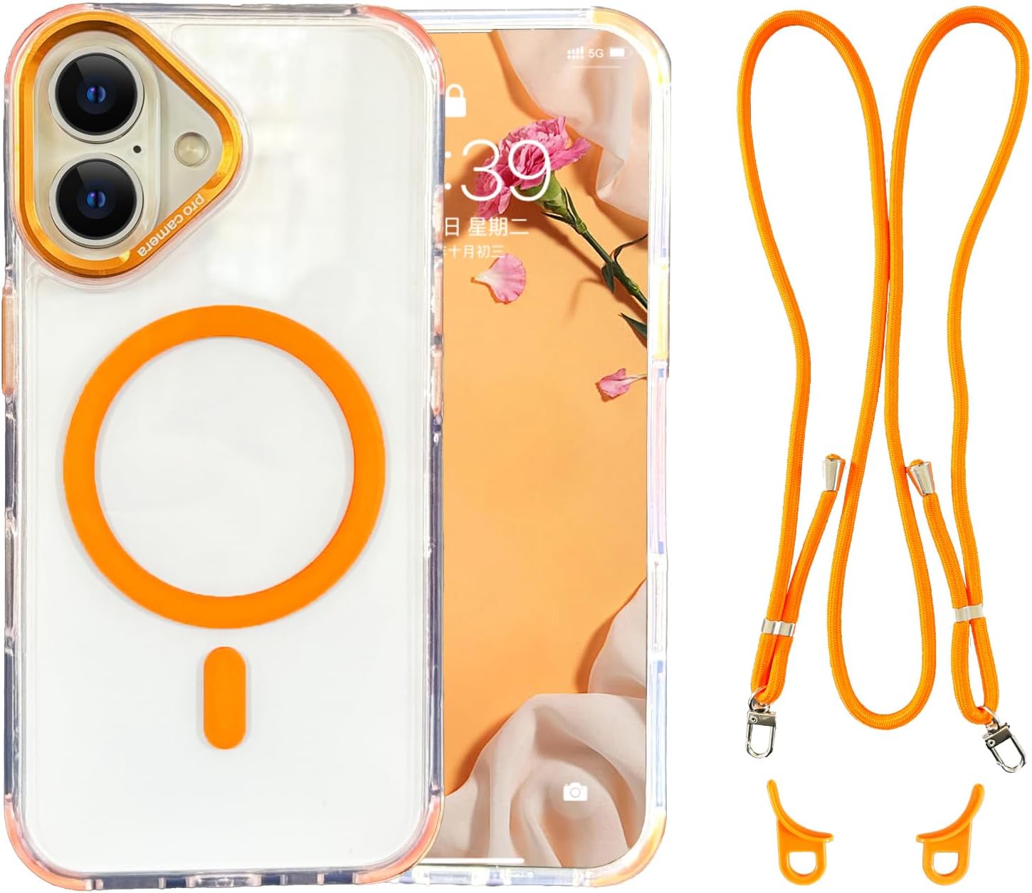 for iPhone 16 Case with Adjustable Phone Lanyard Strap, Compatible with MagSafe, Shockproof Military-Grade Protection, Magnetic Phone Case, Classic Clear Orange Hybrid Case, Yellowing Resistant