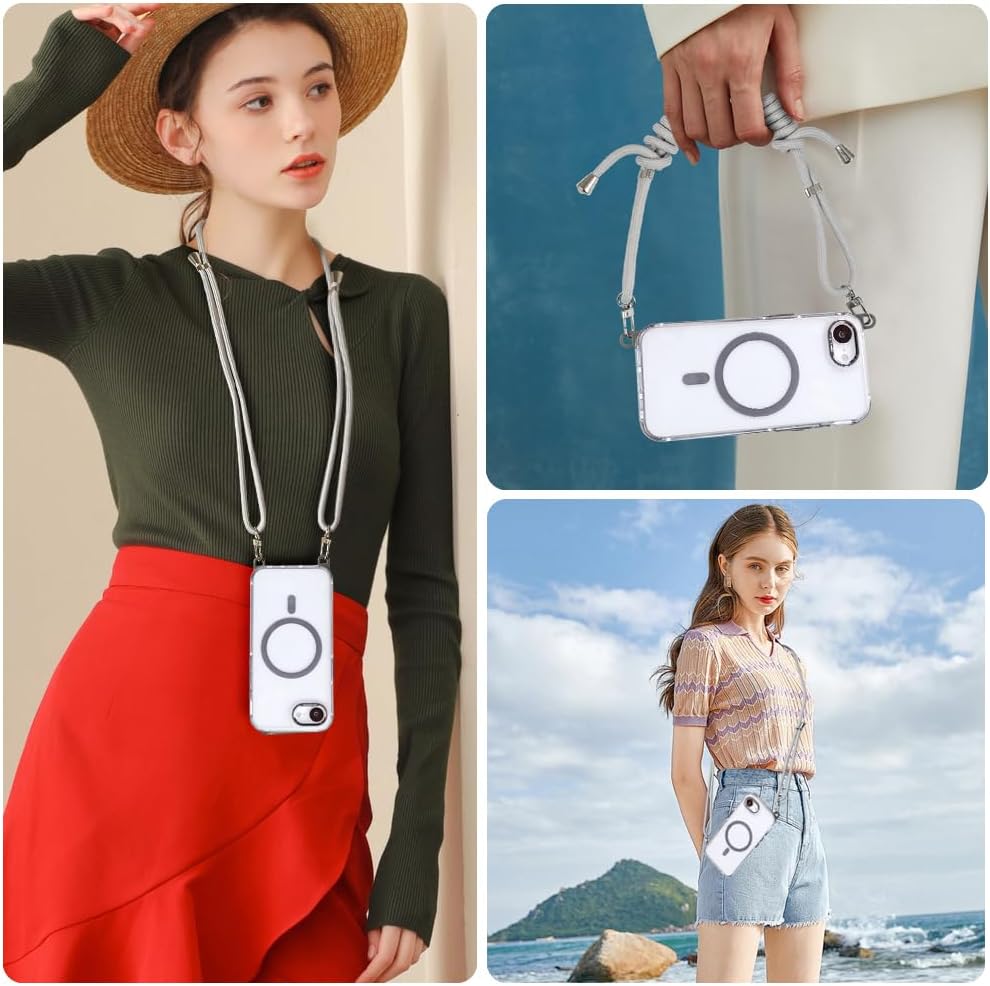 for iPhone 16e Case with Adjustable Phone Lanyard Strap, Compatible with MagSafe, Shockproof Military-Grade Protection, Magnetic Phone Case, Classic Clear Gray Hybrid Case, Yellowing Resistant