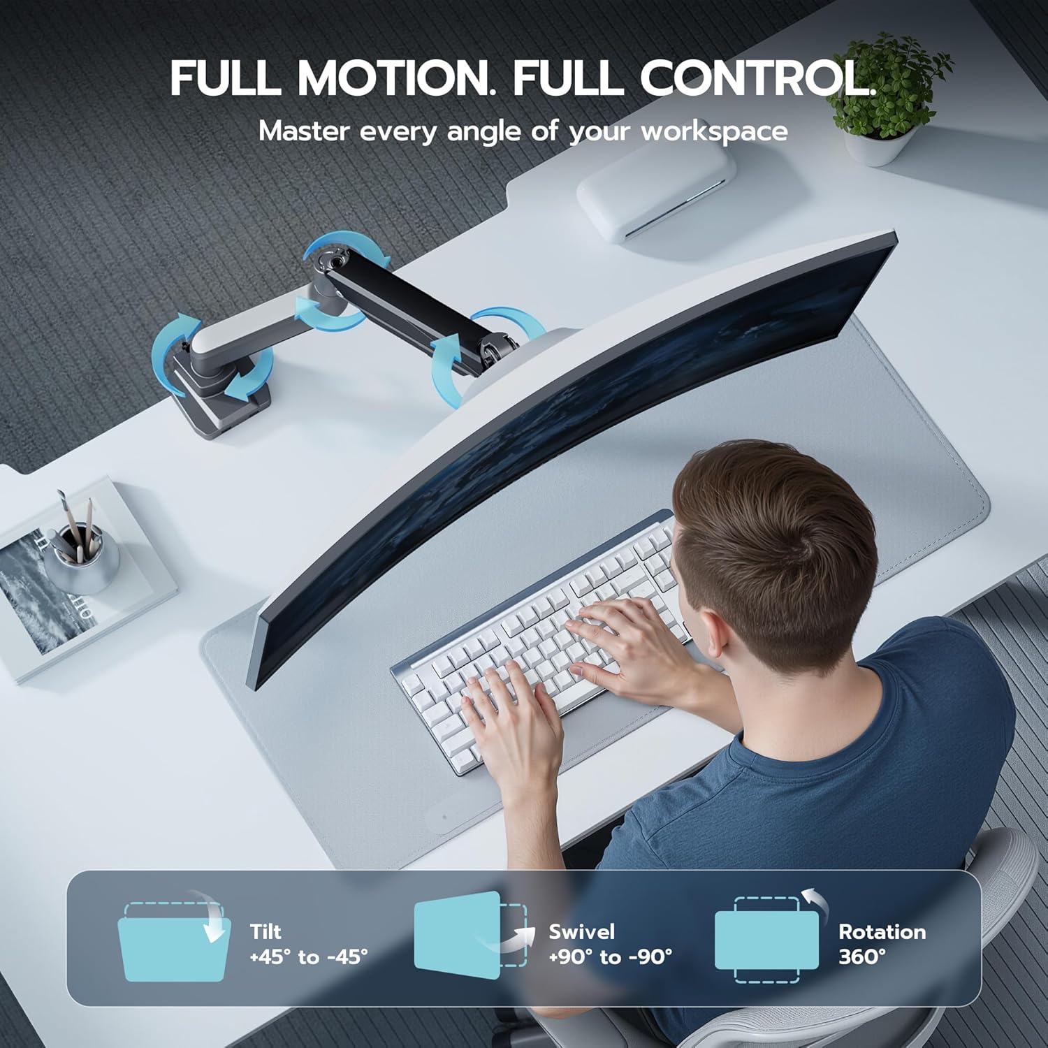 - Ergonomic Comfort & Full Motion - A monitor placed too high, too low, or at the wrong distance can lead to neck and shoulder pain over time. That’s why a monitor arm is more than just an accessory—it’s a game changer for your comfort and health. Unlike standard monitor stands, this fully adjustable arm gives you the flexibility to position your screen exactly where you need it for proper ergonomics.Enjoy effortless adjustments with a wide range of motion: tilt from +45° to -45°, swivel from +90° to -90°, and full 360° screen rotation. Whether you're working, gaming, or multitasking, you’ll always have the perfect viewing angle