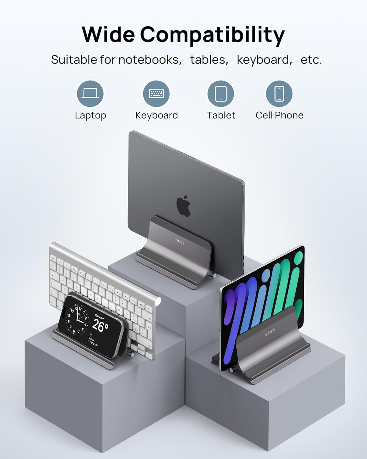 SODI Vertical Laptop Stand for Desk, Aluminum Laptop Holder Compatible with MacBook Pro, MacBook Air Stand Up to 17 inch, Gravity Auto-Lock Cooling, 3in1 Space Saving Desk Organizer Accessories, Gray