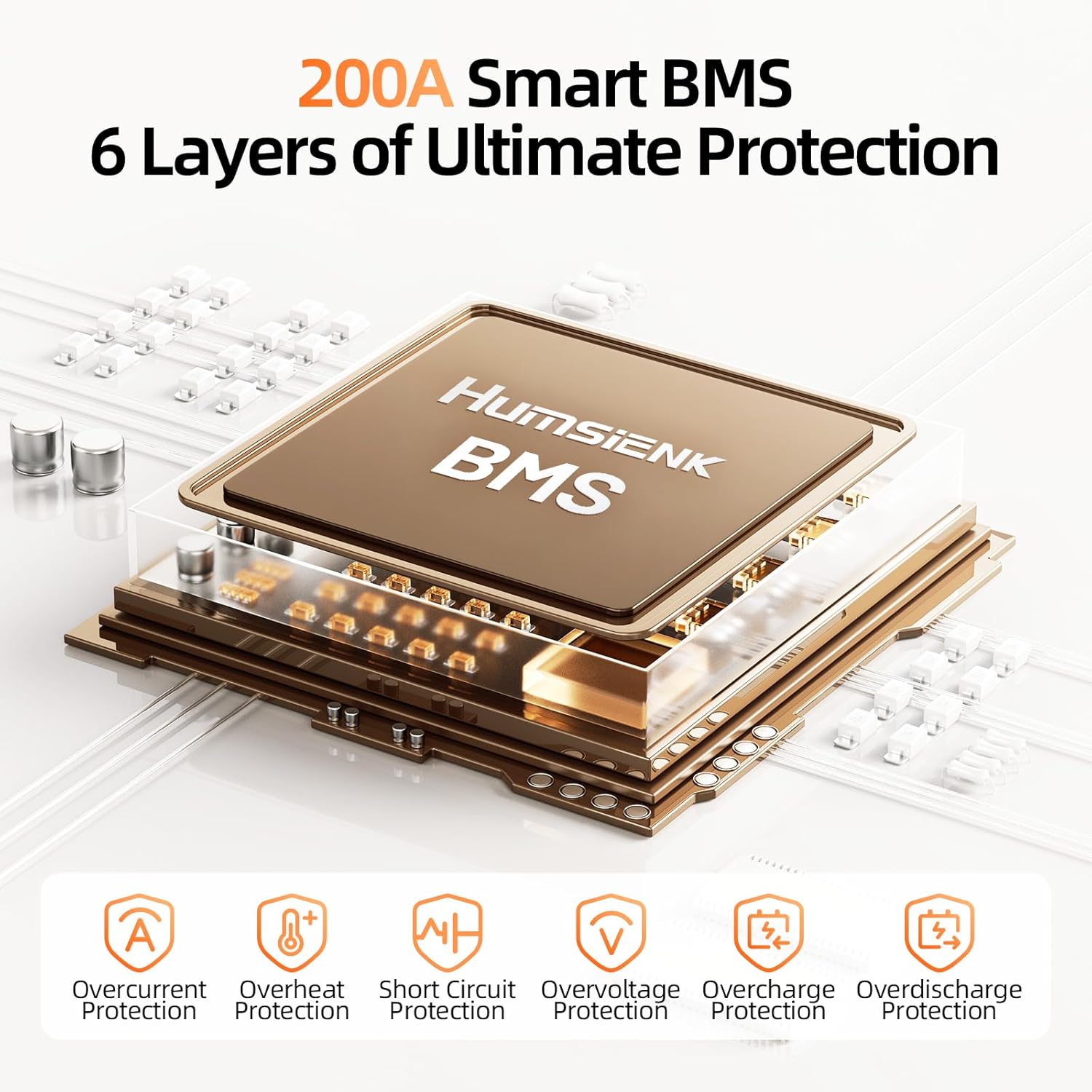 - 📱【Smart Bluetooth Monitoring System】 Stay in control with advanced real-time monitoring via an app that tracks voltage, temperature, and more. The upgraded 200A BMS ensures overcharge, overdischarge, over-current, and short-circuit protection, making it safe for use in golf carts, RVs, trolling motors, solar systems, and more.
