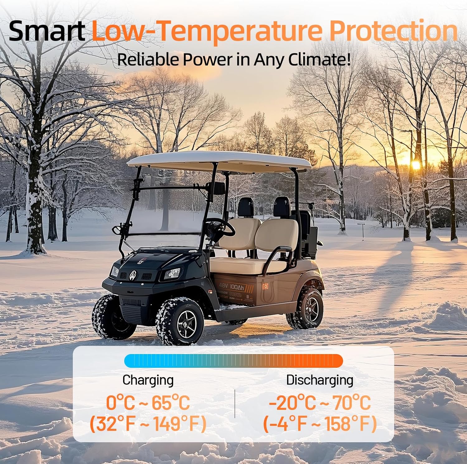 - ⚡【Superior Performance & Longevity】 Upgrade your golf cart with this lightweight 48V 100Ah LiFePO4 battery, weighing only 108 lbs—60% lighter and 35% smaller than traditional lead-acid batteries. With a lifespan of up to 10 years and the ability to deliver 2C discharge capacity (200A) with peak surges to 600A, it effortlessly powers through steep slopes and offers ranges of 50 miles per charge.
