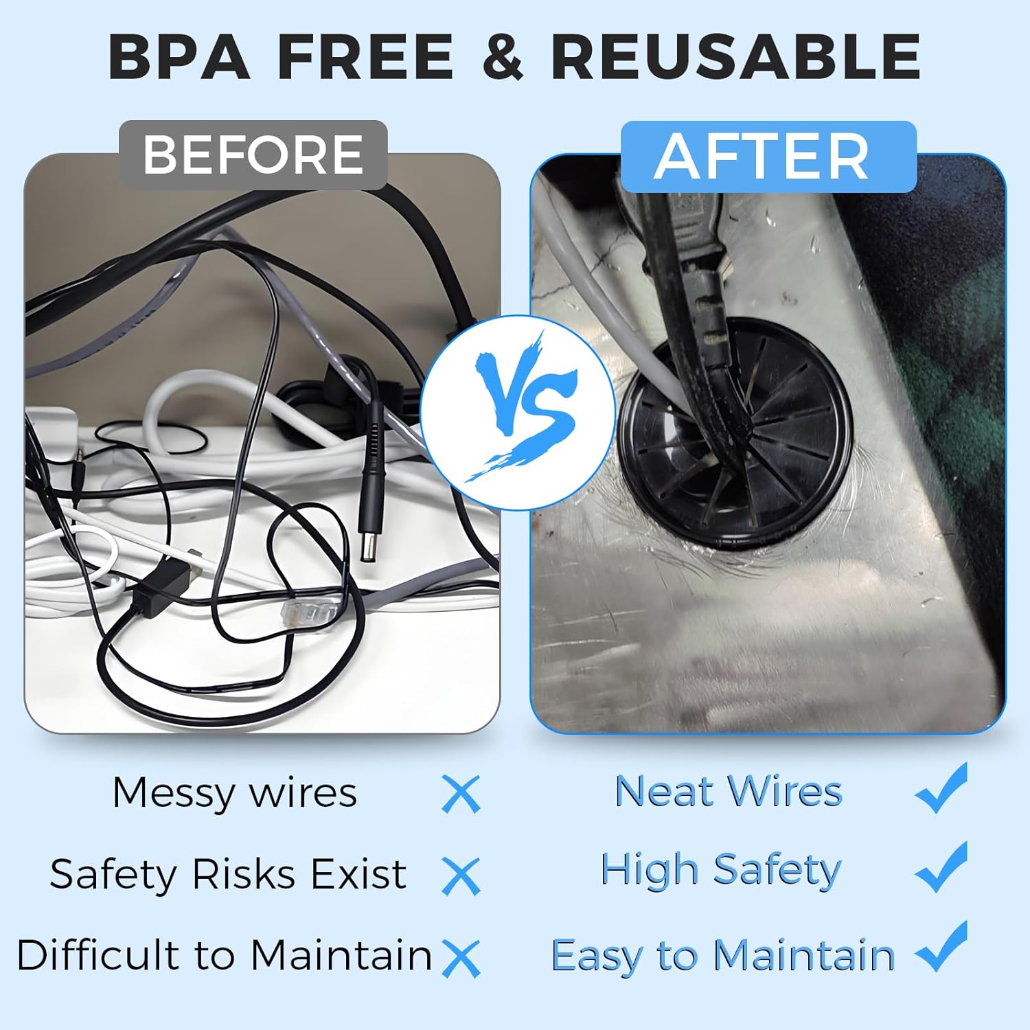 - Maintain Safety: The desk hole grommet helps to organize cables on your desktop, keeping it tidy and improving productivity; The buckle design on both sides ensures secure installation and the petal shaped countertop hole cover smooth surface protects cables from sharp edges, reduces bending and pulling of cables, extends cable life and ensures a safe work area