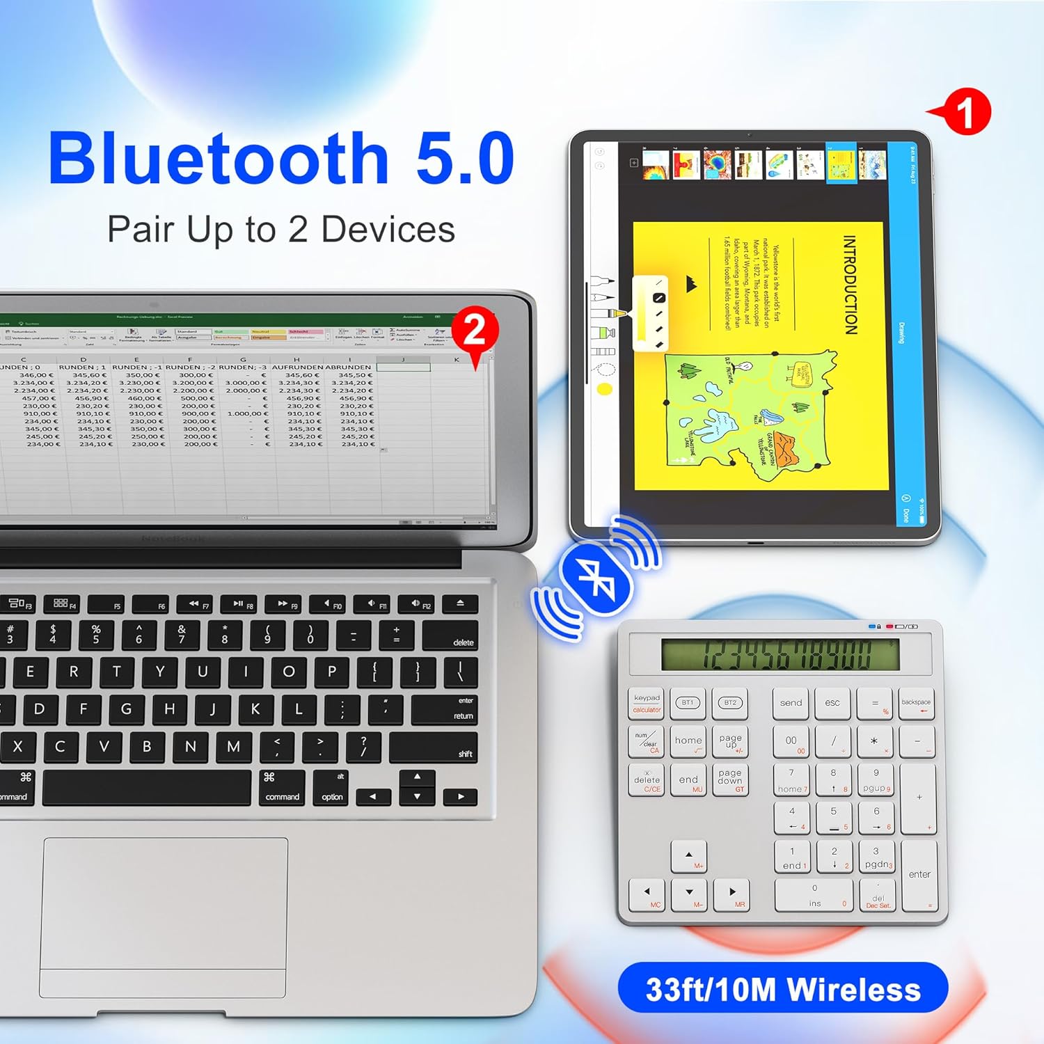 - Simultaneous Dual-Device Connectivity:This bluetooth number pad pairs with two devices (laptop+tablet/phone) via Bluetooth 5.0 within 33ft range. The numeric keypad for laptop solves missing number keys on compact keyboards while maintaining a clutter-free workspace with stable wireless performance.