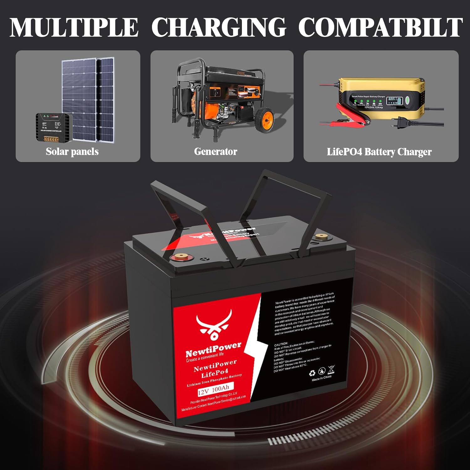- 【Intelligent 100A BMS & MAX Load Power 1280W】: The NewtiPower 12hV 100Ah LiFePO4 battery is equipped with a built-in 100A BMS, which can prevent overcharging, over discharge, overcurrent, and short circuit. This BMS is already higher than the average level of BMS used in the same capacity batteries on the market, allowing us to connect to more usage scenarios and support a maximum load power of 1280W, Continuous current 100A, peak current 200A,so we no longer have to worry about the problem of load not running.