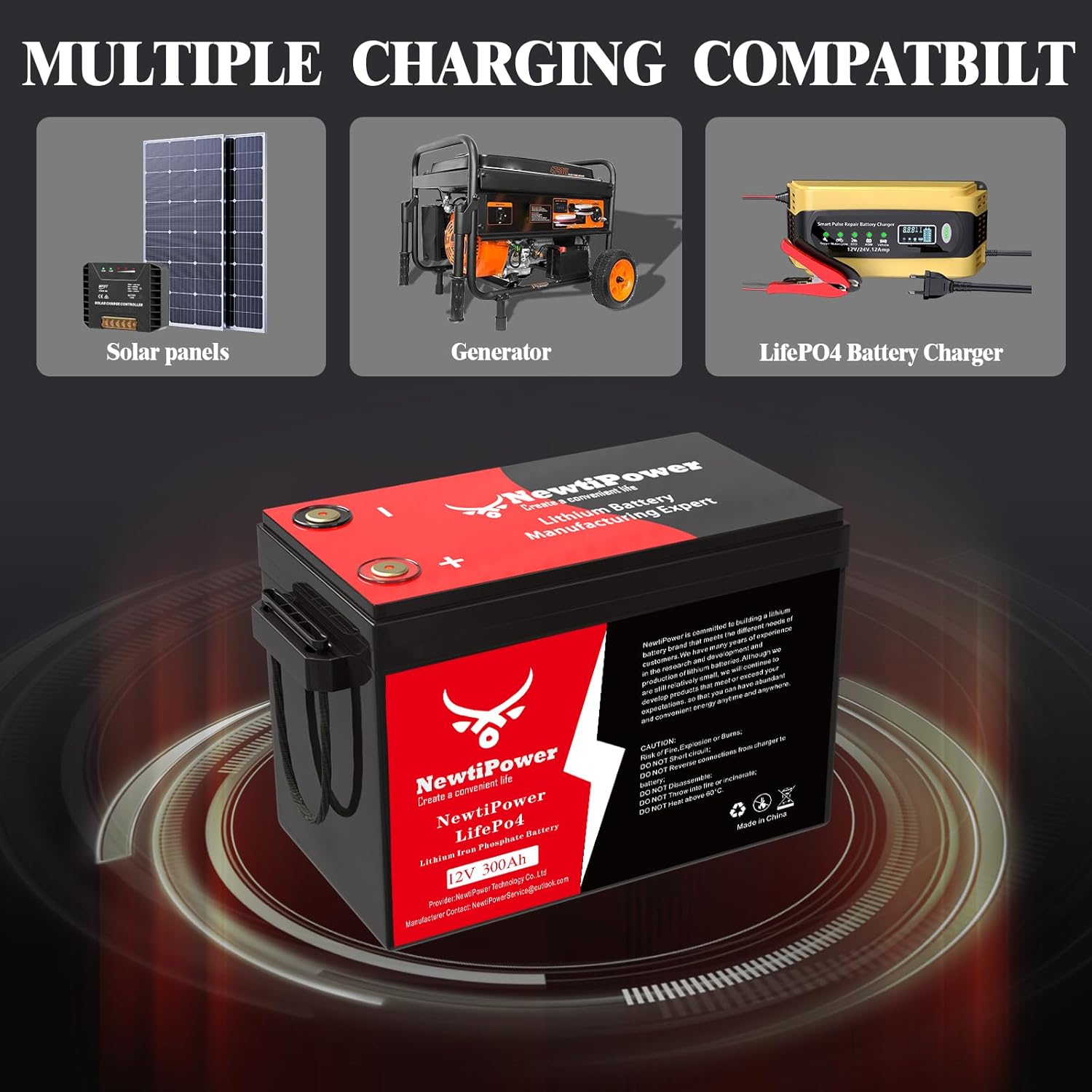 - 【Supporting 6S or 6P expansion】:NewtiPower 12V lithium battery 300Ah can be connected in parallel or series (up to 6S6P) to achieve larger capacity (up to 1800Ah) and higher voltage (24V, 36V, 48V, 60V, 72V), making it the best choice for many applications such as solar systems, RVs, travel trailers, caravans, solar energy, marine, home backup power, off grid, camping, sailing, etc. The ultra long battery life provides you with reliable power and enjoyable long-distance travel.