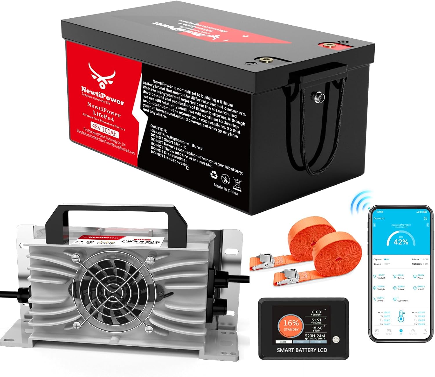 - 【Intelligent 200A BMS & MAX Load Power 10.2K W】: The NewtiPower 48V 100Ah LiFePO4 battery is equipped with a built-in 200A BMS, which can prevent overcharging, over discharge, overcurrent, and short circuit. This BMS is already higher than the average level of BMS used in the same capacity batteries on the market, allowing us to connect to more usage scenarios and support a maximum load power of 10.2KW, Continuous current 250A, peak current 500A,so we no longer have to worry about the problem of load not running.