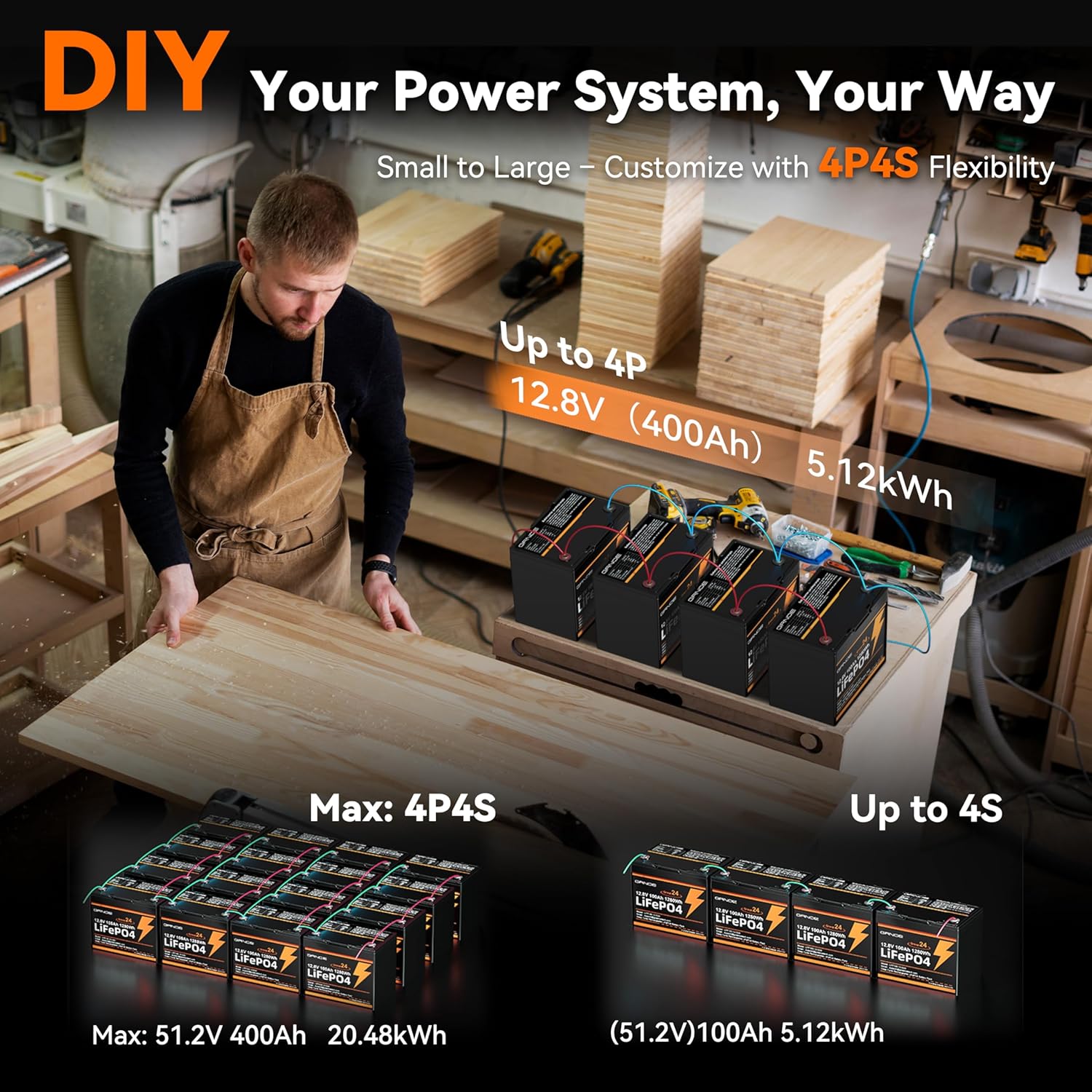 - 【DIY POWER EXPANDABLE – FROM TROLLING TO BACKUP POWER】 Supports series & parallel connections (up to 4S4P) to scale capacity up to 20.48kWh. Suitable for powering trolling motors (30–70lb thrust), car fridges, CPAPs, backup vehicle power banks, and more.