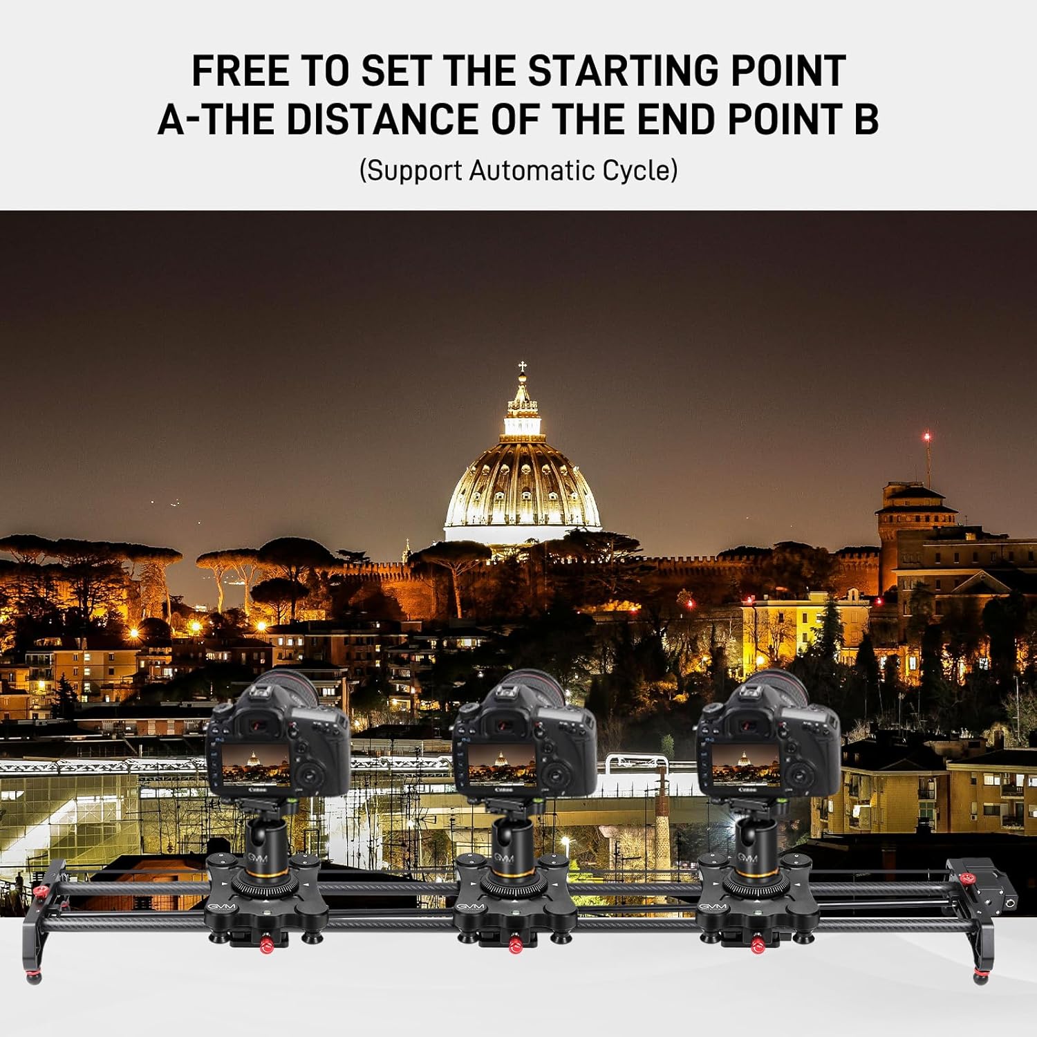 - 【Three shooting modes】Tracking shooting: Adjust the red knobs on both sides of the camera slide to the upper left or lower right corner. The slide supports time-lapse shooting or video shooting, as well as manual and electric modes. 120° Panorama: The slide rail has a 120° panoramic mode, which can be achieved by adjusting the red knobs on both sides of the camera. Horizontal shooting: Freely set the distance between the starting point, A-end point B (supports automatic cycle).
