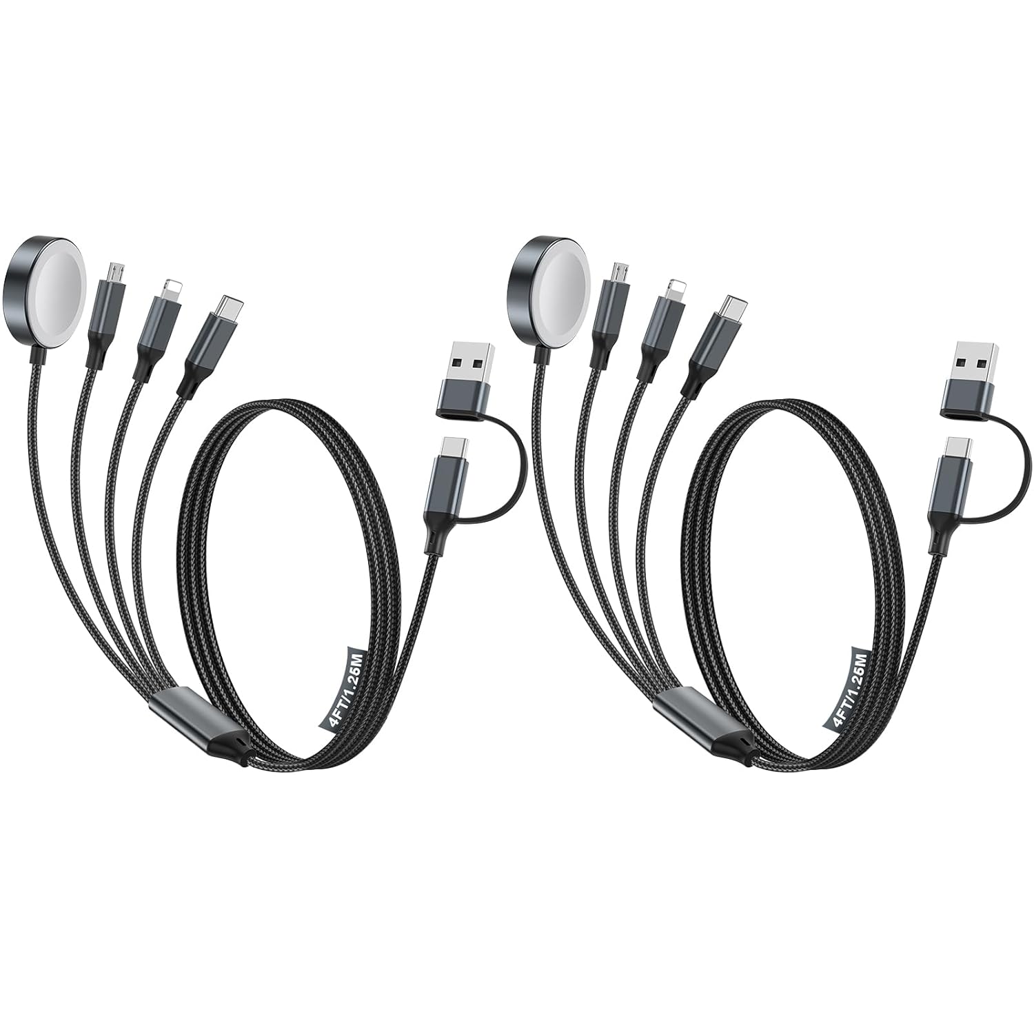 - 【4-in-2 Charger for Multiple Devices】This 4-in-2 charging cable is equipped with Type C/USB A input port and four output ports compatible with Type-C, Ligntning, Micro and iWatch respectively. This multi-function charging cable is compatible with Type C and USB A chargers, which is a universal choice for various devices and a travel essential for personal travel. One Charging cable is enough for all your devices to charging, and it is also suitable for PS4 charger.