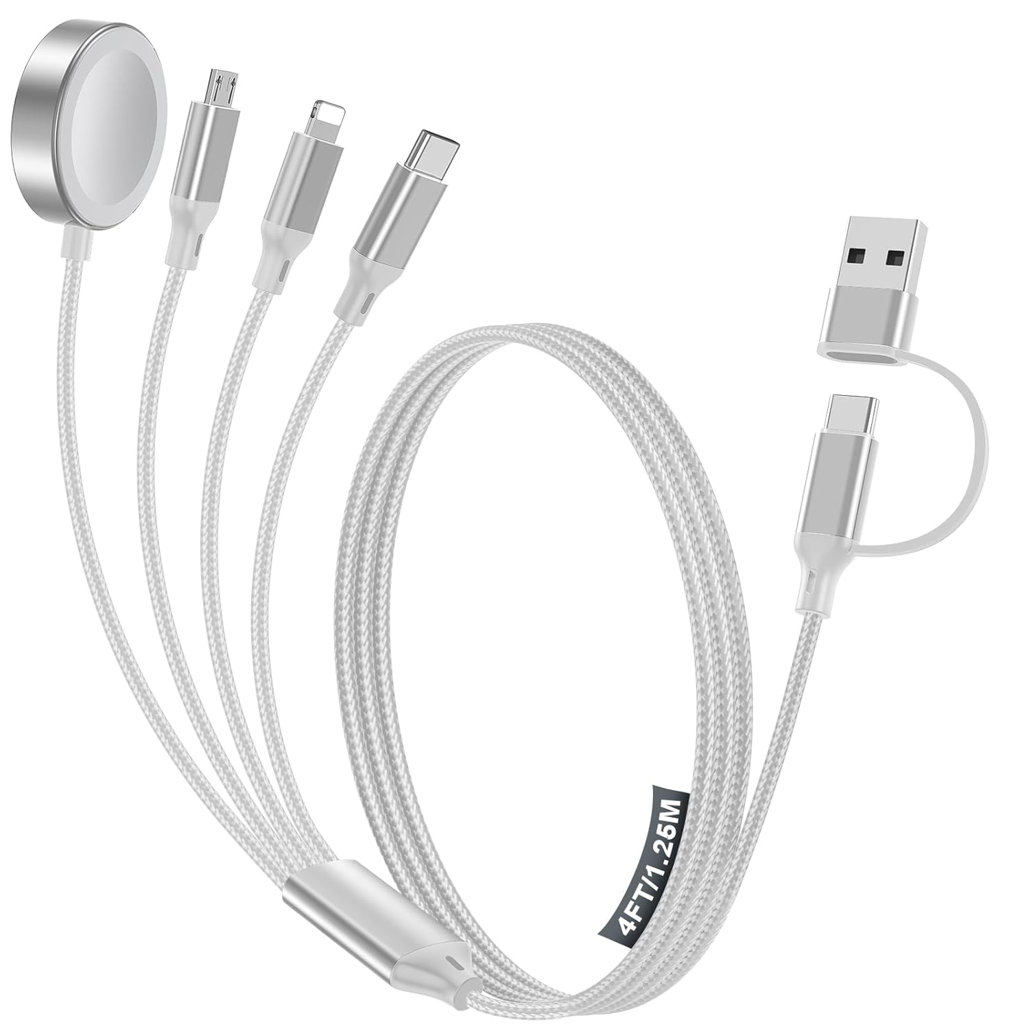 - 【4-in-2 Charger for Multiple Devices】This 4-in-2 charging cable is equipped with Type C/USB A input port and four output ports compatible with Type-C, Ligntning, Micro and iWatch respectively. This multi-function charging cable is compatible with Type C and USB A chargers, which is a universal choice for various devices and a travel essential for personal travel. One Charging cable is enough for all your devices to charging, and it is also suitable for PS4 charger.