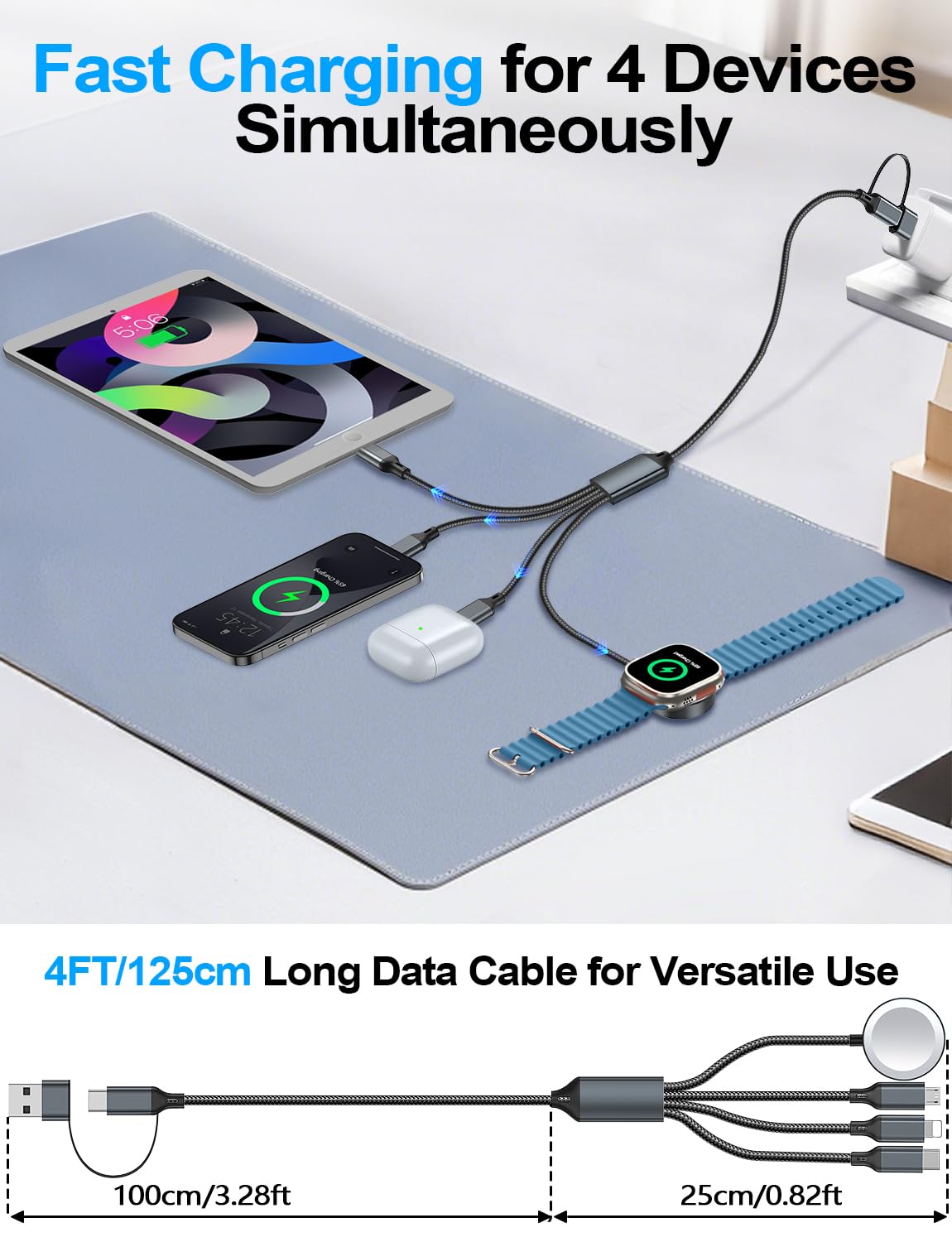 - 【Compatible Multi Devices】1,This multi-function charging cable can be used for Apple Watch series 1/2/3/4/5/6/7/8/9/10/SE/SE2/Ultra/Nike. 2, Suitable for iPhone 16/15/14/13/12/11/8/7/6/5 series, xS/XR /X/XS MAX for iPad 1-9 generations, iPad Air/iPad Mini series Air Pods 1/2/3/4/Pro/Samsung S24/S23/S22/S21/S20/S10/Google Pixel 2 XL/3 XL/4 XL/5/6a/7 Pro/Multi Bluetooth headsets, charging fans, hand warmers, etc.(Note:1,Please take off the watch case when charging the iwatch.2,To better charge your device,please use a 5V/3A adapter)